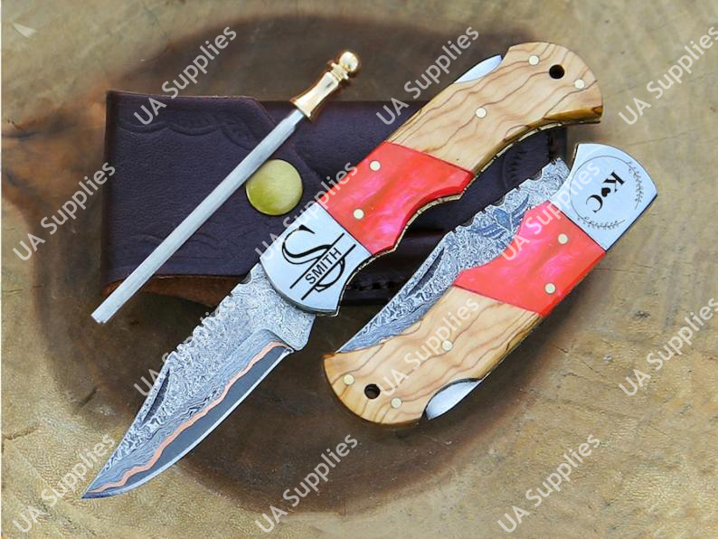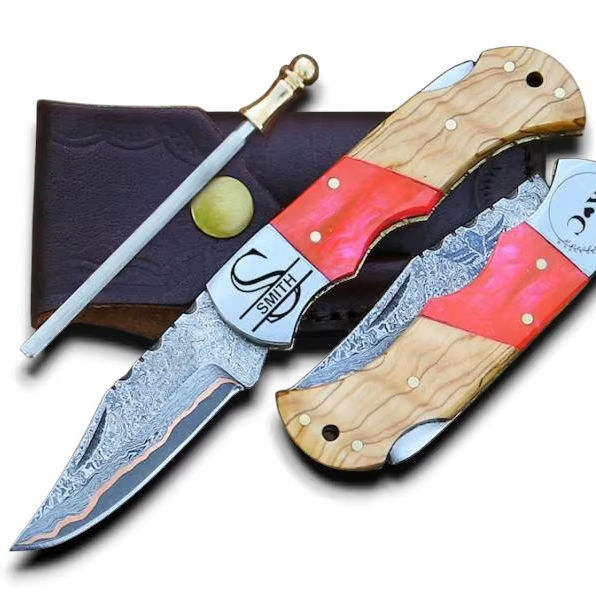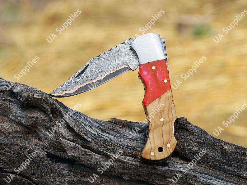 มีดพับอเนกประสงค์ทำมือจากทองแดงซานไม ดามัสกัส ด้ามไม้มะกอกผสมเรซิ่น ปรับแต่งได้ตามต้องการ รับผลิตแบบ OEM/ODM ขายส่ง ความยาวรวม 6.5 นิ้ว