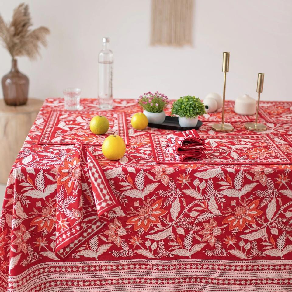 ผ้าปูโต๊ะผ้าฝ้ายอินเดียพิมพ์ลายดอกไม้สีแดงสีแดงสีแดงเข้มทำด้วยมือผ้าคลุมโต๊ะขนาดพิเศษสำหรับงานปาร์ตี้ในบ้านโรงแรม