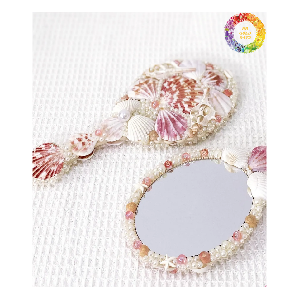 กระจกเปลือกหอยทำด้วยมือพร้อมไข่มุกกระจกความงามงานฝีมือสำหรับกระเป๋าชายหาดชุดเครื่องแป้งนางเงือกสำหรับเดินทางขนาดกะทัดรัด
