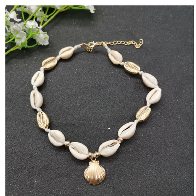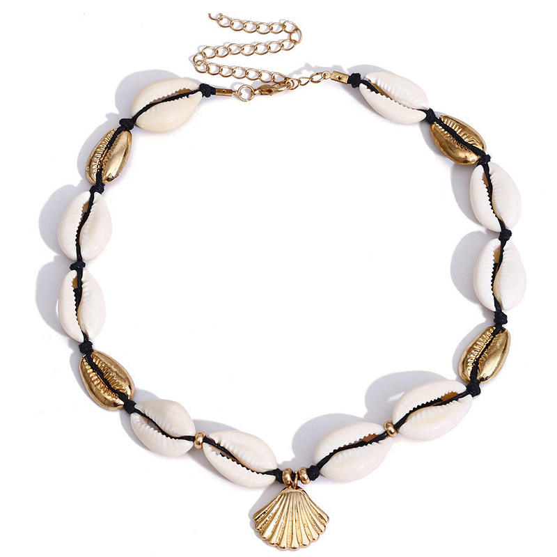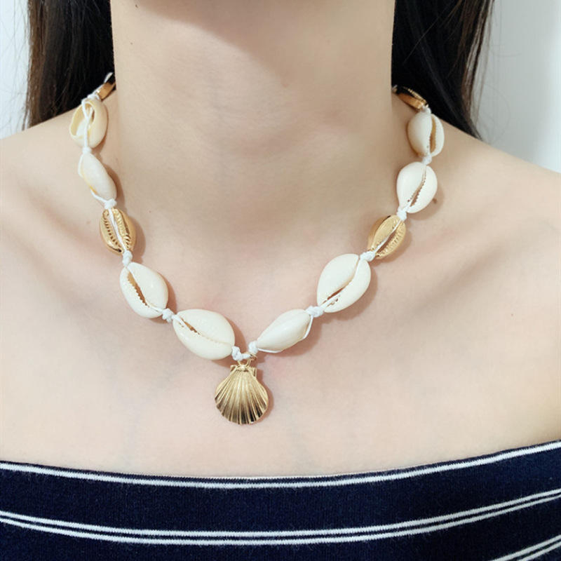 สร้อยคอเปลือกหอยทำมือพร้อมจี้เปลือกหอยสีทอง ลูกปัดสีขาว สายคล้องคอสำหรับผู้หญิง เครื่องประดับลำลอง จี้แฟชั่นโลหะผสมสังกะสี