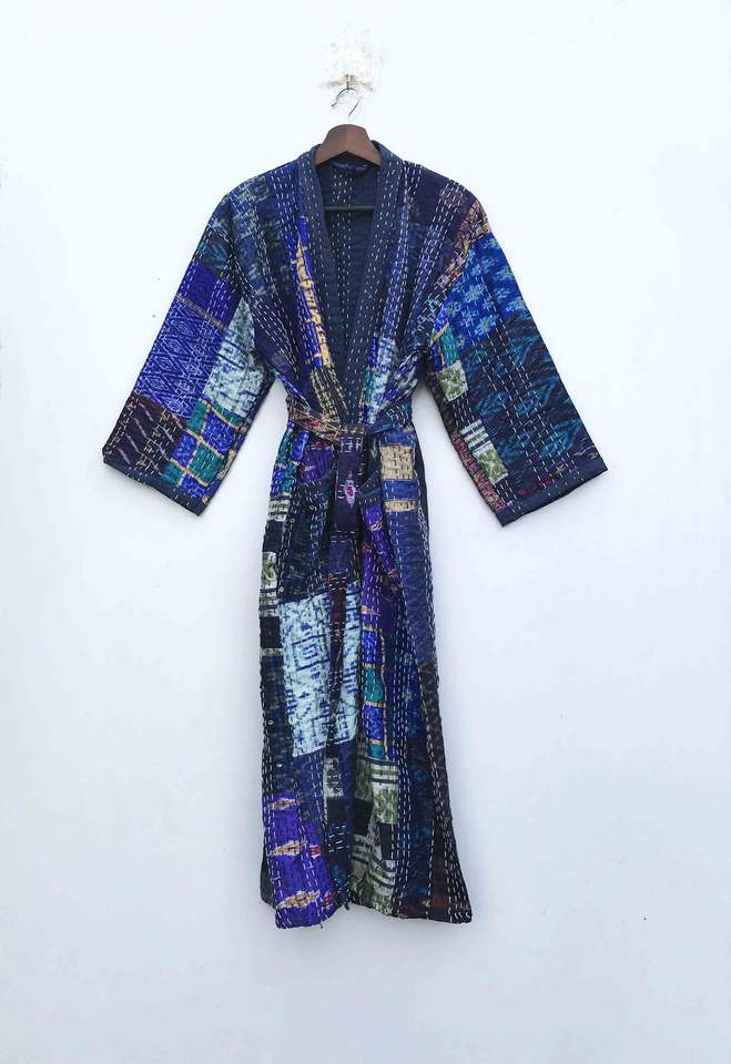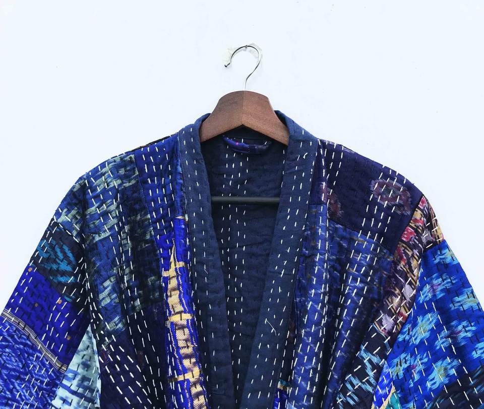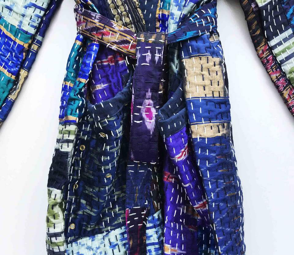 เสื้อแจ็คเก็ตผ้าไหมปะติดปะต่อแบบแฮนด์เมด สไตล์กิโมโนญี่ปุ่น ชุดชายหาดสไตล์โบฮีเมียน เสื้อโค้ทผูกเข็มขัดหลากสีสำหรับฤดูหนาว