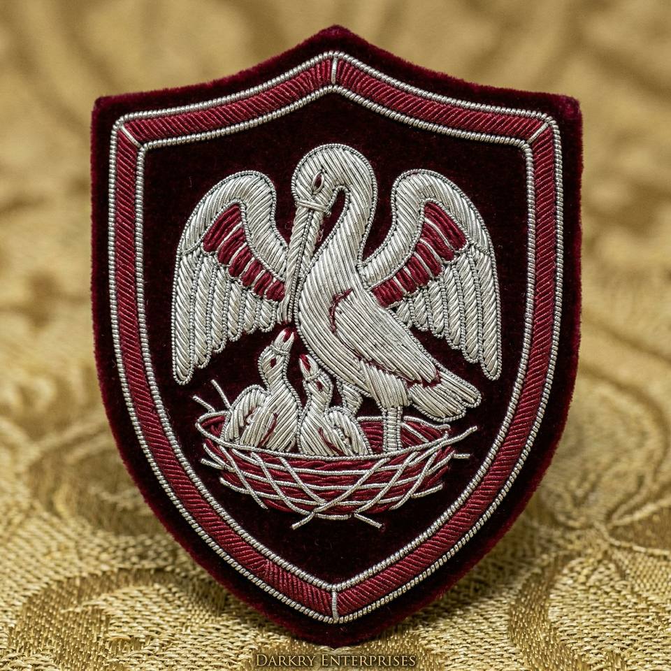ตราสัญลักษณ์รูปไม้กางเขนและมงกุฎอัศวินเทมพลาร์ ทำด้วยมือจากเงินแท่ง สำหรับพิธีกรรมยอร์ค ริท งานปักแบบพิเศษสำหรับเครื่องแบบ