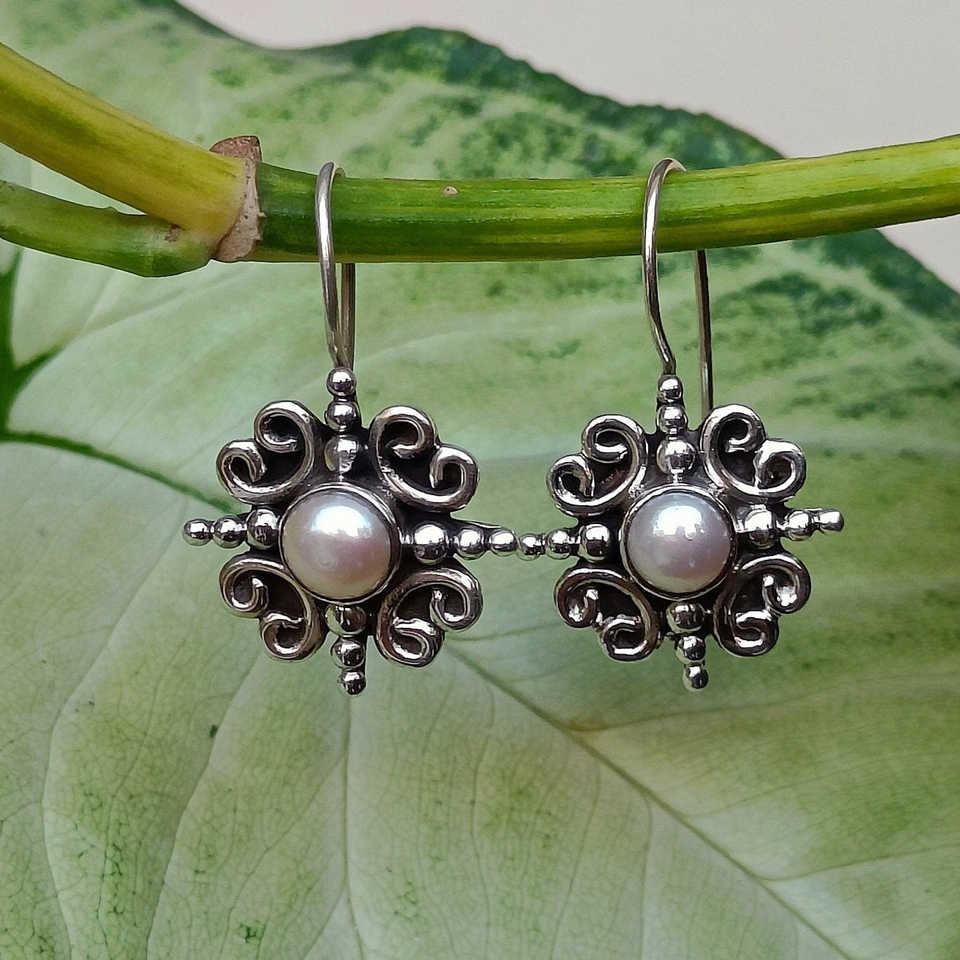 ต่างหูมุกน้ำจืดเงินแท้ทำมือ ลายดอกไม้ เครื่องประดับมุก ของขวัญสำหรับเจ้าสาว