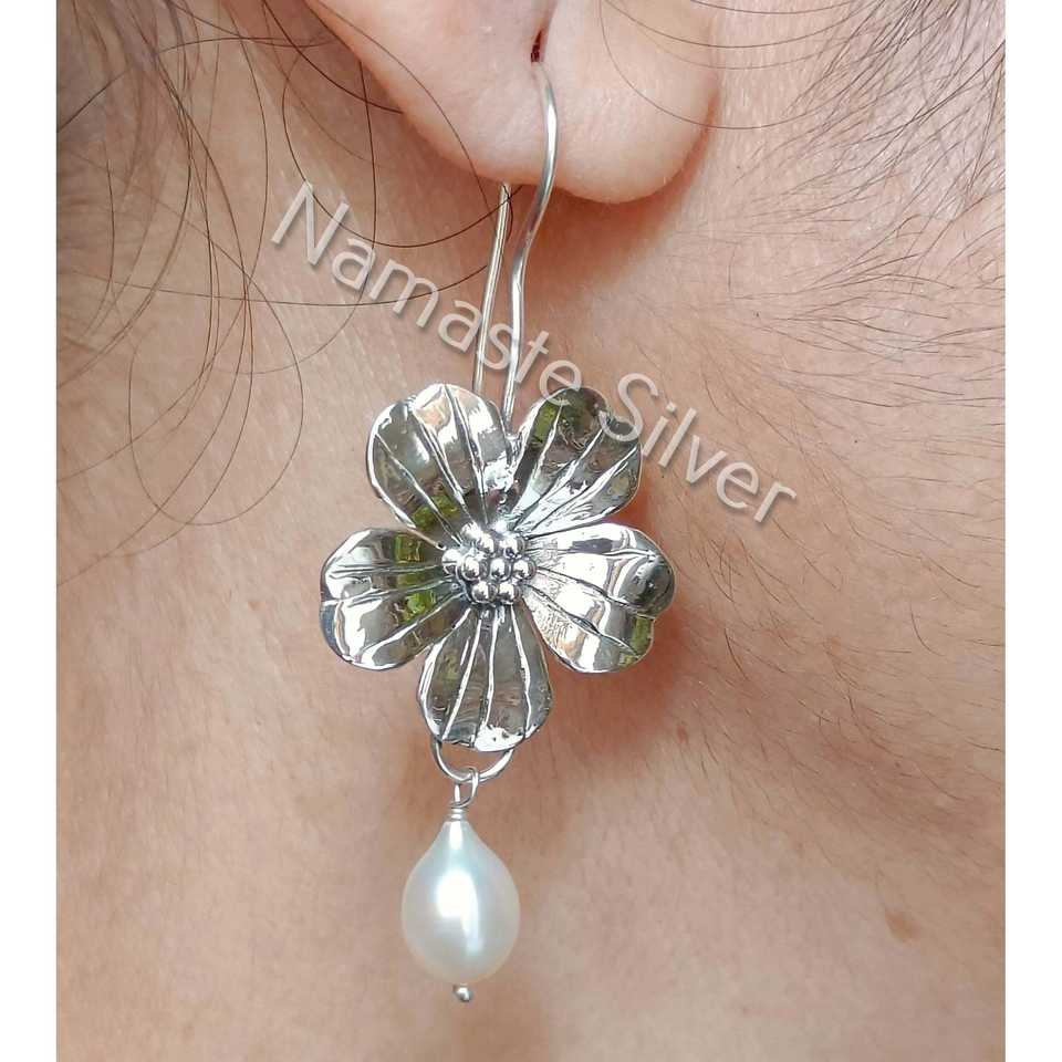 ต่างหูมุกน้ำจืดเงินแท้ทำมือ ดีไซน์ดอกไม้สไตล์วินเทจ เครื่องประดับมุก
