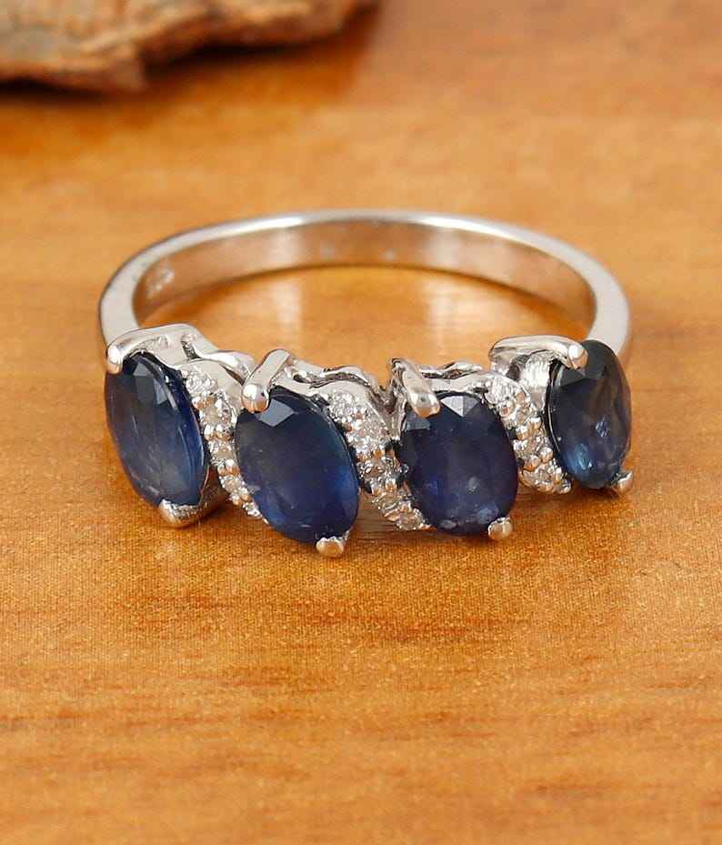 แหวนเงินทำด้วยมือสำหรับผู้หญิงสวยไพลินธรรมชาติขนนกหินวันเกิดรูปไข่ของขวัญเครื่องประดับสำหรับเธอ