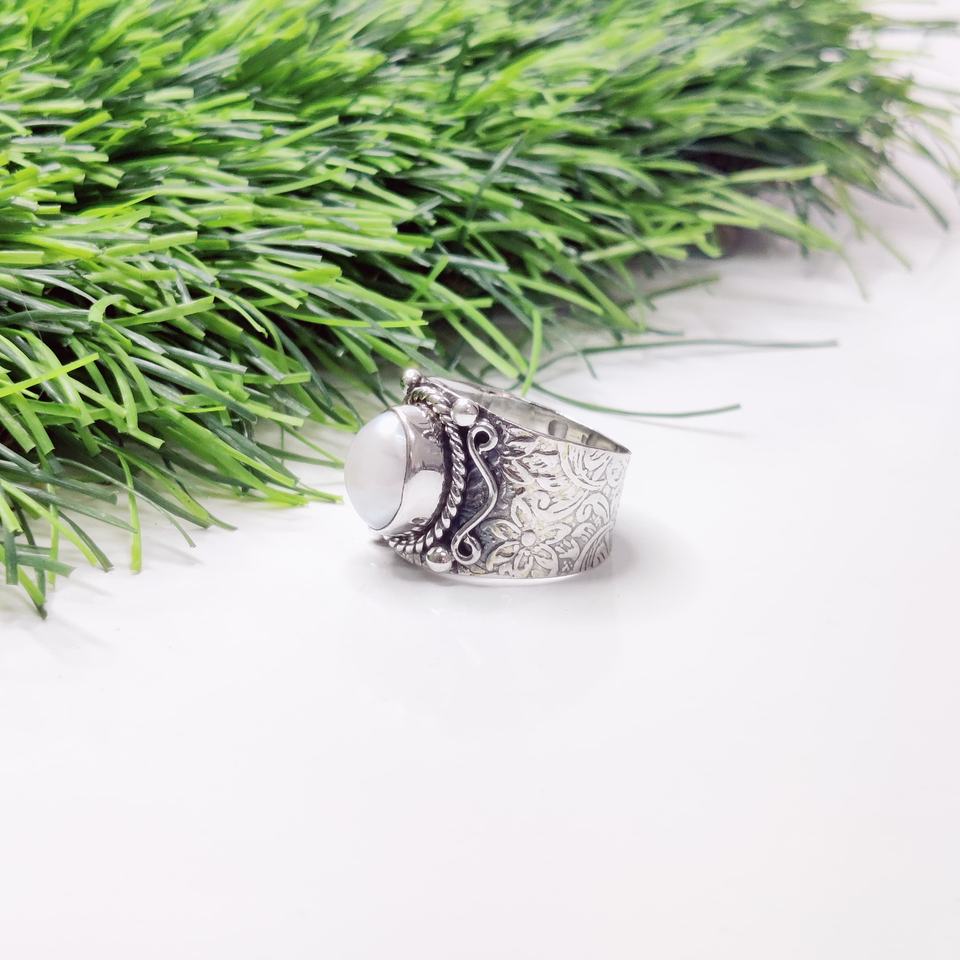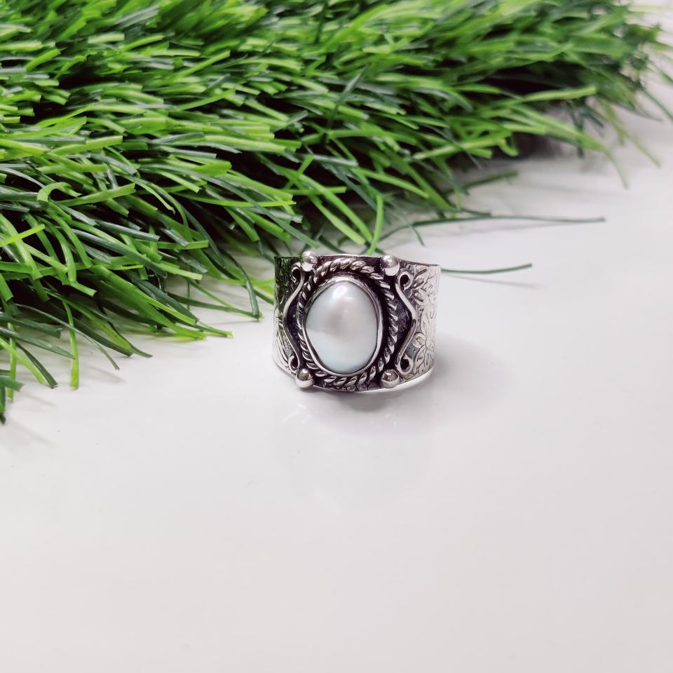Handmade 925 Sterling Silver Freshwater Pearl Religious Style Unisex Ring Gemstone Accentuated Band