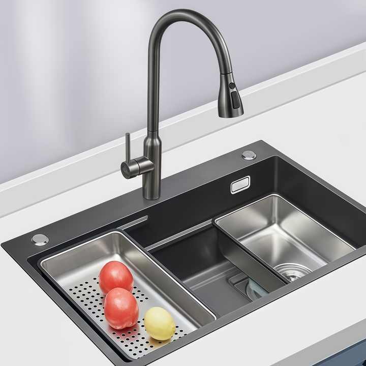 อ่างล้างจานครัวแบบทำมือ ช่องเดียว สีดำนาโนไทเทเนียม ความจุขนาดใหญ่ ดีไซน์แบบฝังสองชั้น