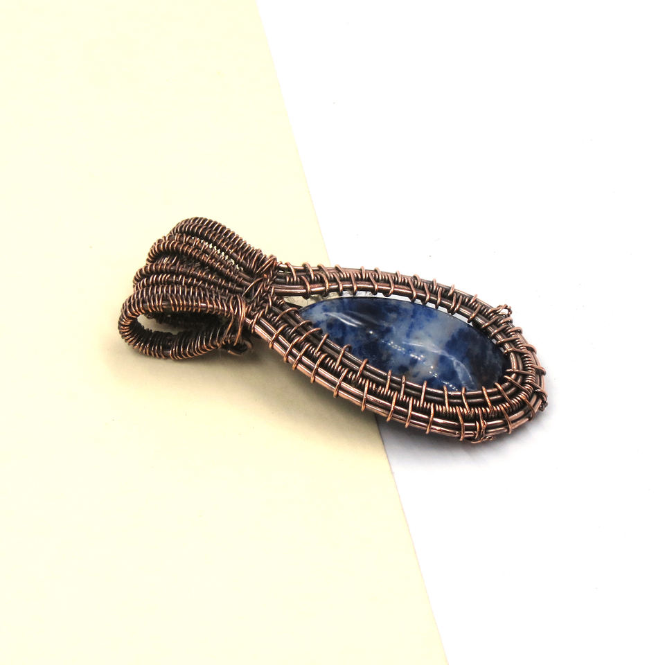 จี้ห้อยคอทำมือประดับโซดาไลต์แบบพันลวด – พลอยทรงลูกแพร์ธรรมชาติ, จี้ทองแดงชุบโรเดียมสีดำสำหรับขายส่ง