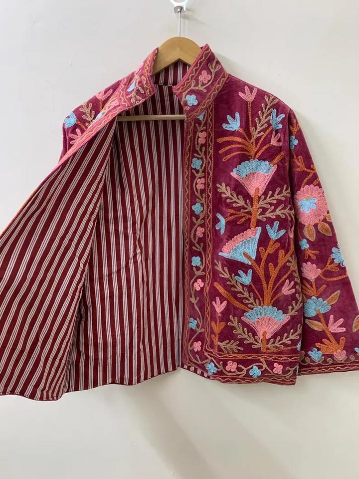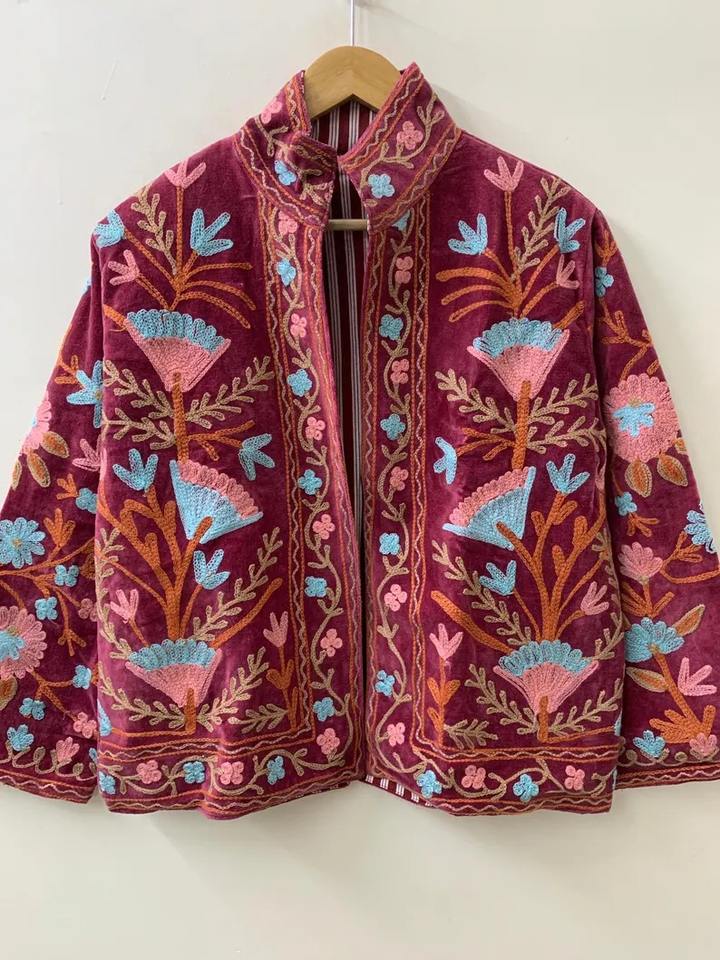 เสื้อแจ็กเก็ตกำมะหยี่นุ่มของผู้หญิงเสื้อแจ็กเก็ตสั้นปักลายทำด้วยมือ