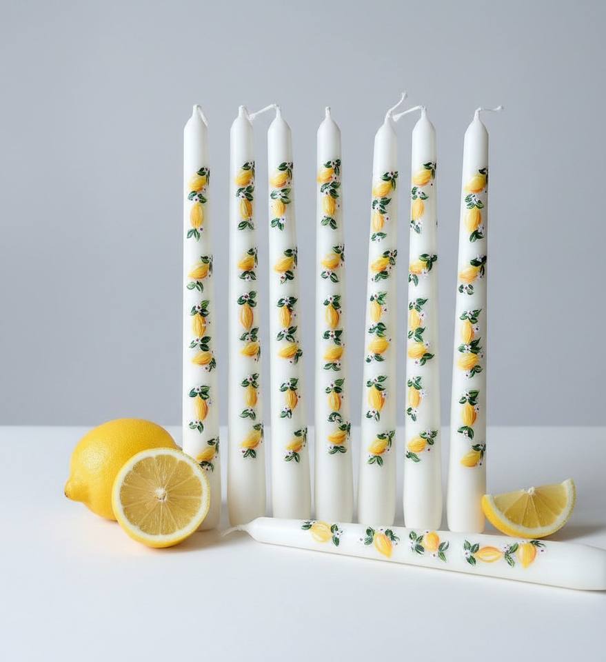 เทียนแท่งทำมือจากขี้ผึ้งถั่วเหลืองและพาราฟิน กลิ่นมะนาว ดอกไม้สีเขียวอ่อน ใบไม้หอมซินนามอน ไร้ควัน เหมาะสำหรับงานแต่งงาน