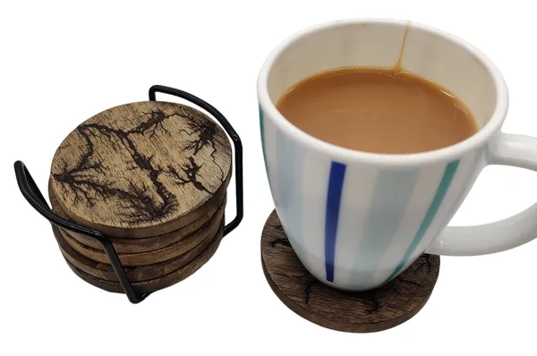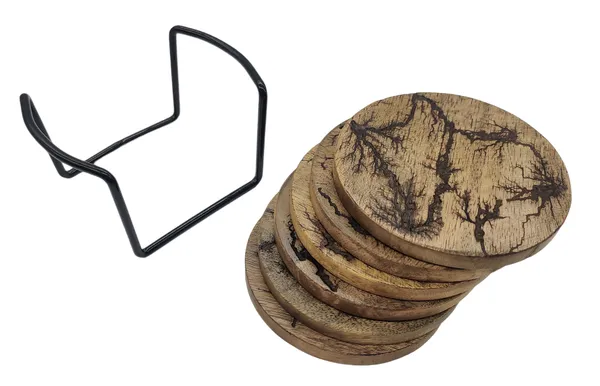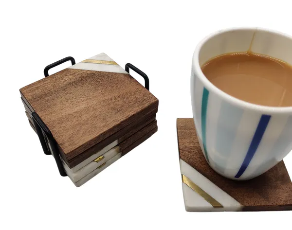 แผ่นรองแก้วไม้สี่เหลี่ยมทำมือ ดีไซน์หรูหรา ไม้และหินอ่อน พร้อมฐานโลหะสีดำ ชุดเสิร์ฟ 6 ชิ้น