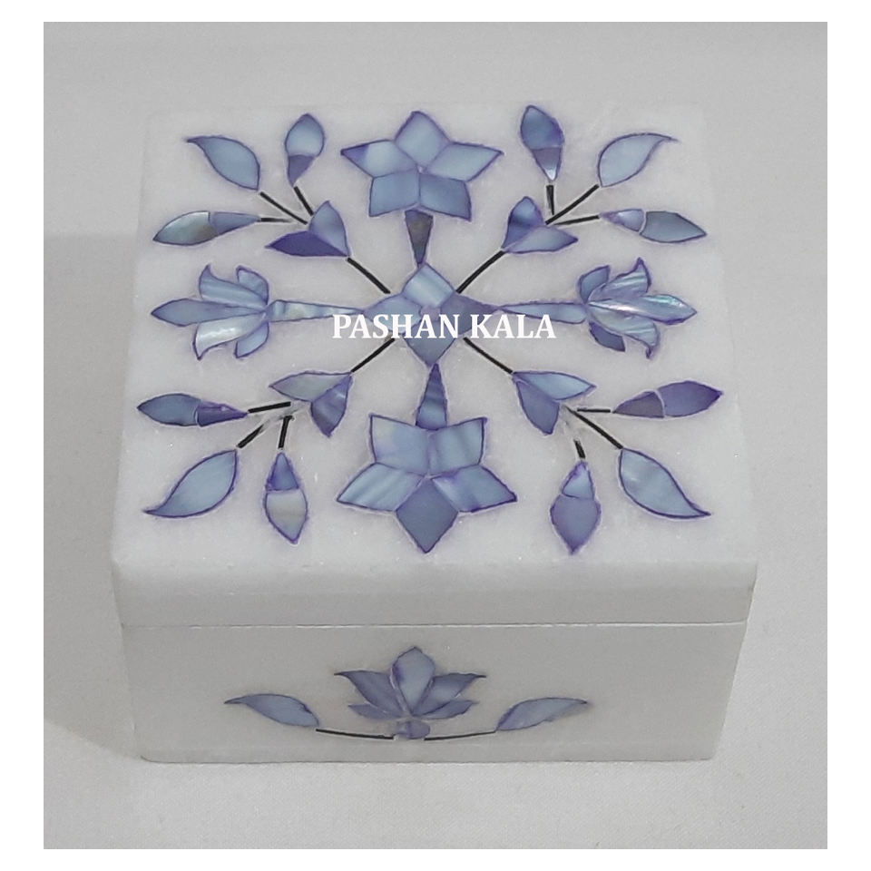 กล่องสี่เหลี่ยมฝังทำด้วยมือสีฟ้างานดีกล่องเครื่องประดับหินอ่อนสีขาวมุกสำหรับตกแต่งบ้านและของขวัญ