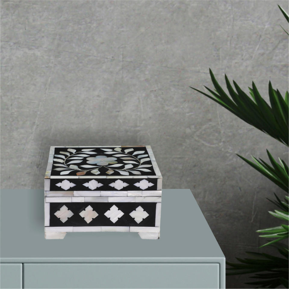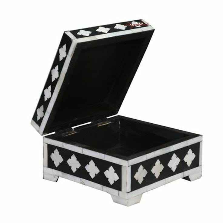 "กล่องเครื่องประดับไม้สี่เหลี่ยมทำด้วยมือพร้อมสลักกระดูกสีขาวสีดำและรูปแบบทางเรขาคณิตดอกไม้ที่เก็บของตกแต่ง"