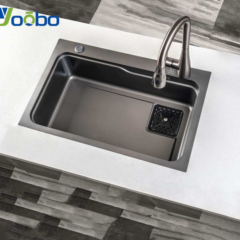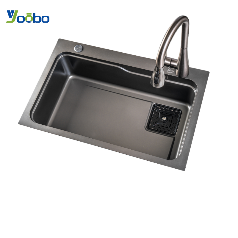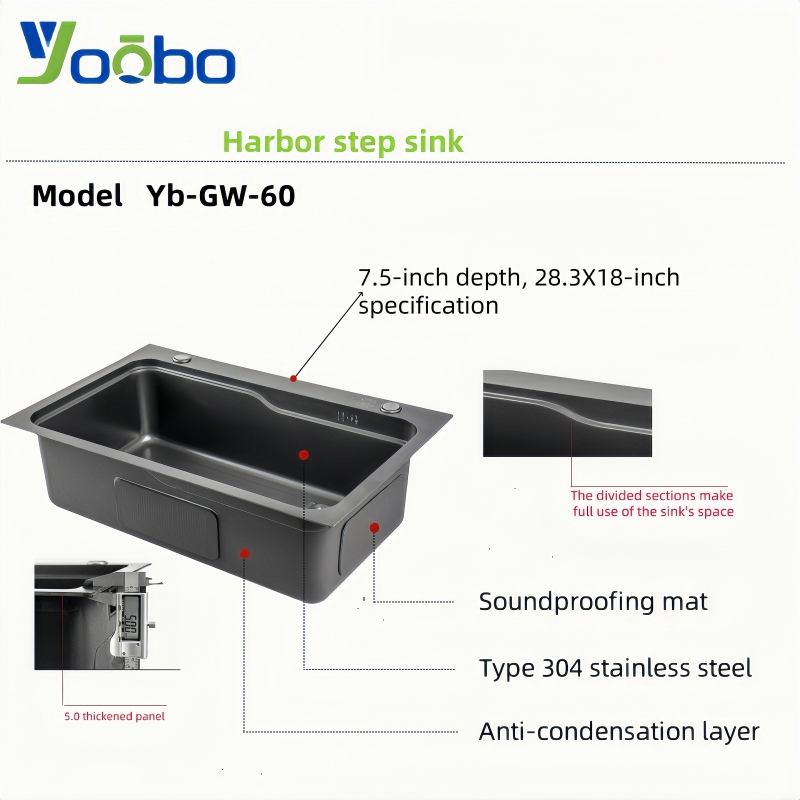 อ่างล้างจานสเต็ปแฮนด์เมด สเตนเลส 201 สีดำไทเทเนียมนาโน พร้อมตะกร้ากรอง