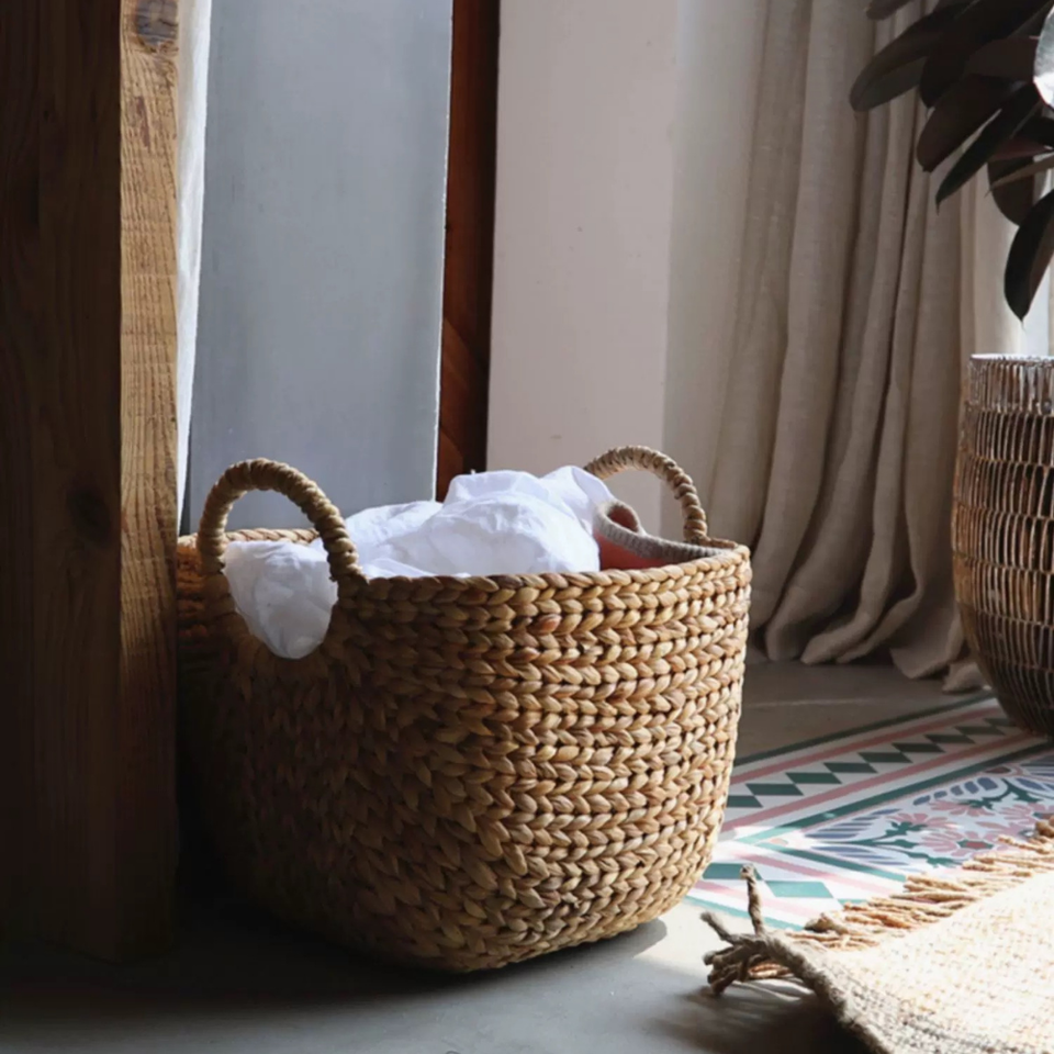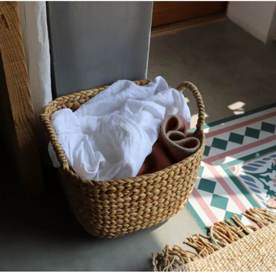 ตะกร้าซักผ้าผักตบชวาทำมือตะกร้าใส่เสื้อผ้าน้ำหนักเบาทนทานเป็นมิตรต่อสิ่งแวดล้อมสำหรับผู้ซื้อโรงแรมซูเปอร์มาร์เก็ต