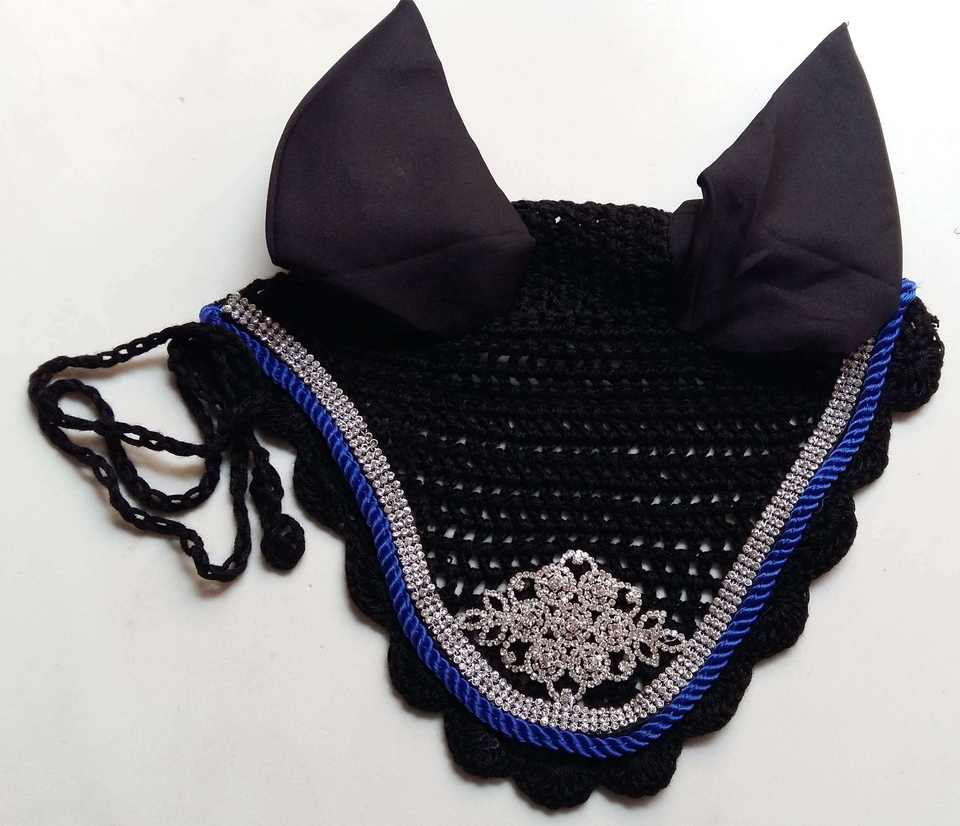 Handmade Stylish Crochet Horse Ear Bonnet with Glitter Trim Durable Fly Veil for Riding Training & Competition Matching Sets