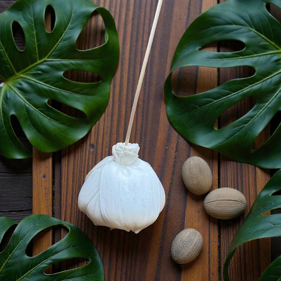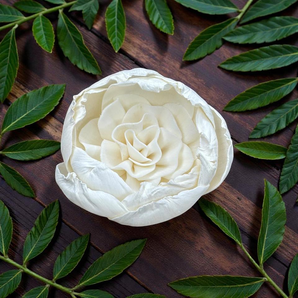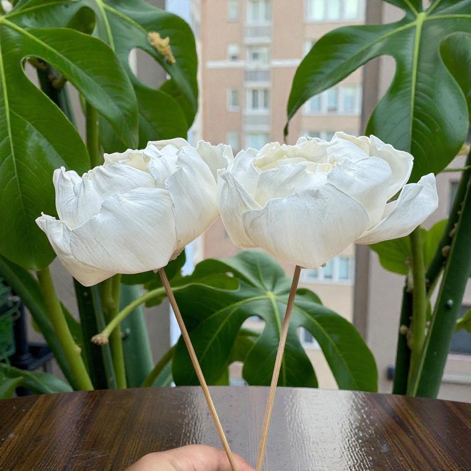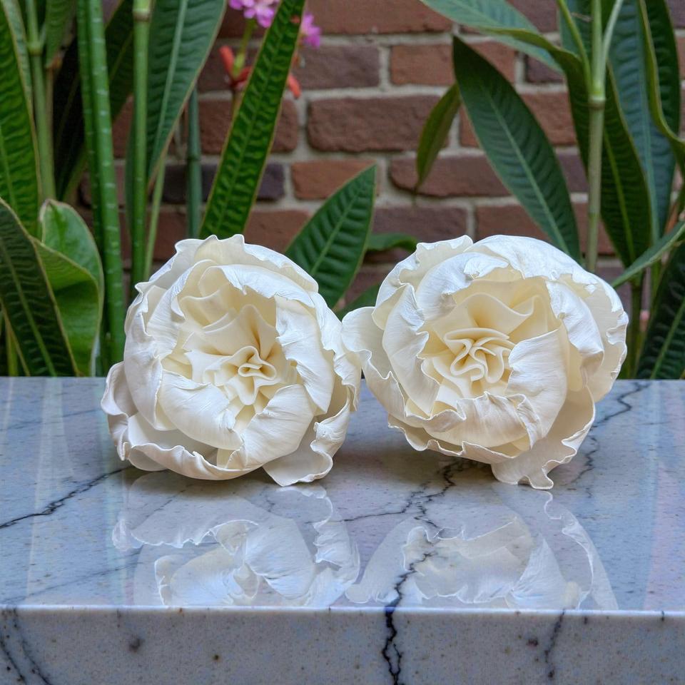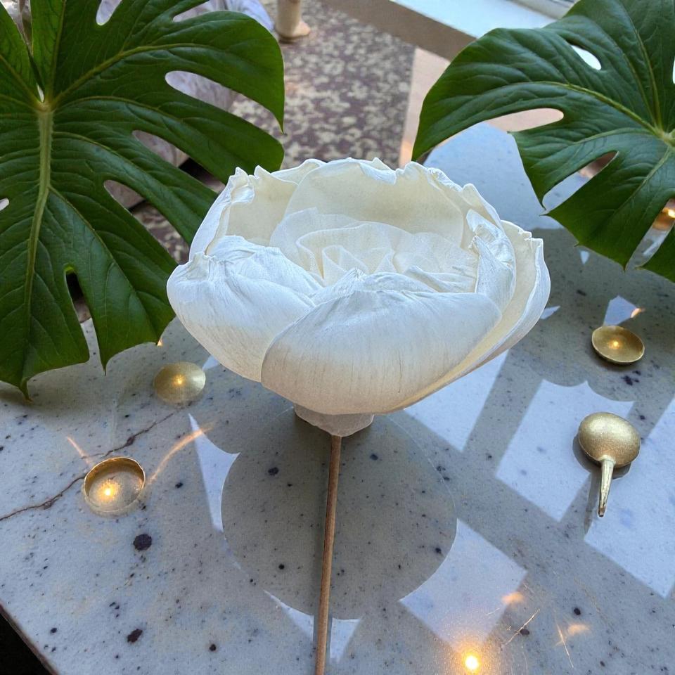 ดอกไม้ไม้โซล่าสีขาวรูปดอกคามีเลียทำมือแบบยั่งยืน ขนาด 8.5 ซม. พร้อมก้านไฟเบอร์จากพืชเซสบานียา จากประเทศไทย