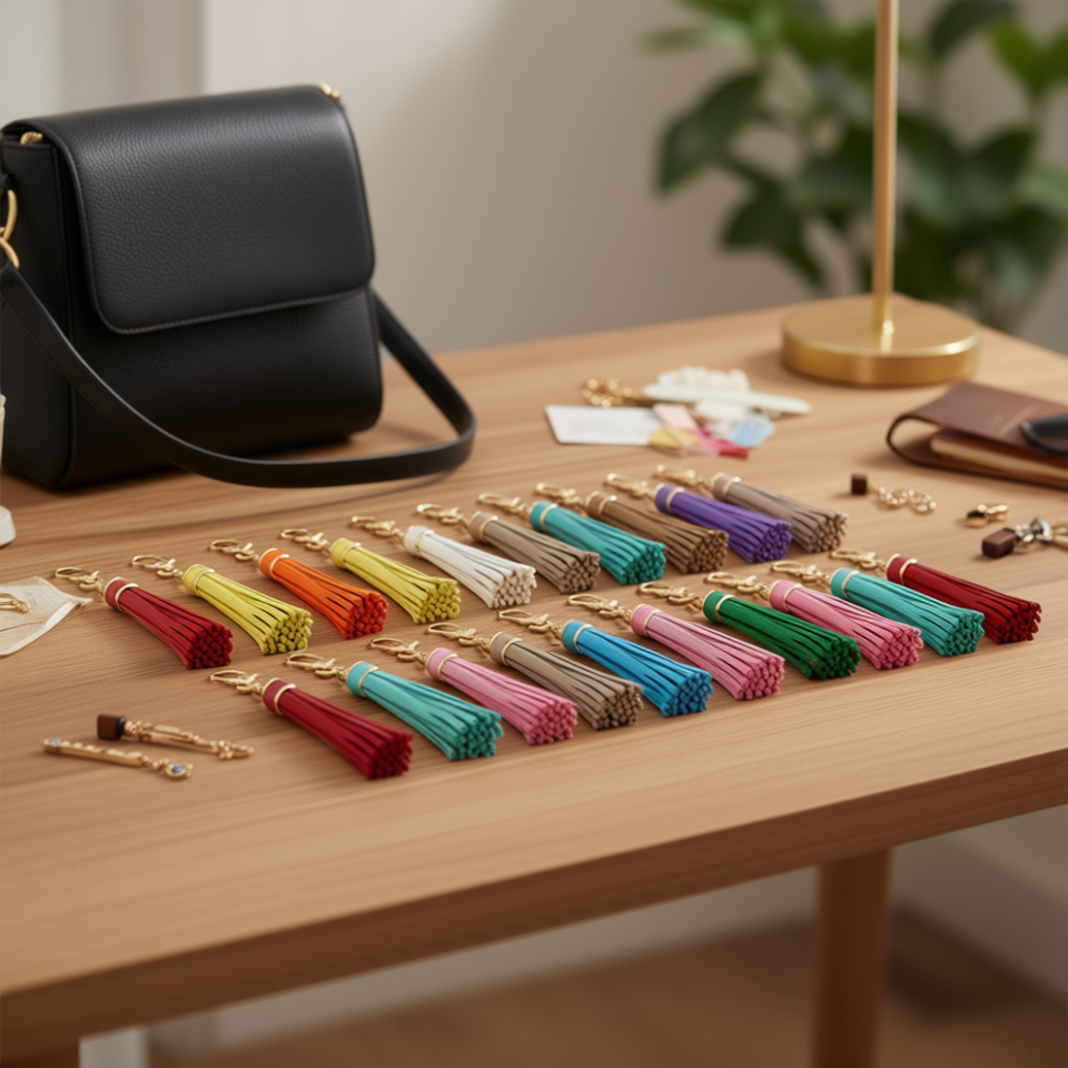 พวงกุญแจหนังทำมือประดับพู่หลากสี สำหรับตกแต่งกระเป๋า ของขวัญ คุณภาพสูง ผลิตในจีนโดย DingH
