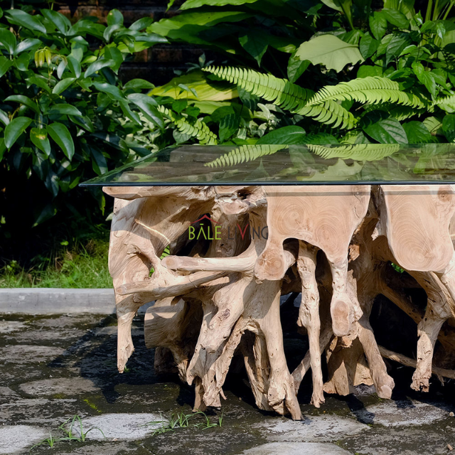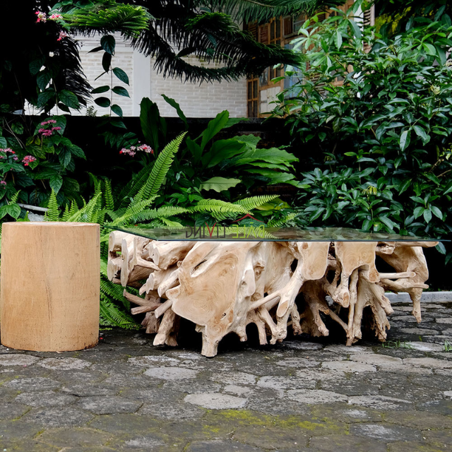 โต๊ะกาแฟรากไม้สักทำด้วยมือสำหรับห้องนั่งเล่นธรรมชาติที่ไม่เหมือนใครพร้อมดีไซน์แบบชนบทที่เป็นมิตรกับสิ่งแวดล้อมและกระจกที่แข็งแรง