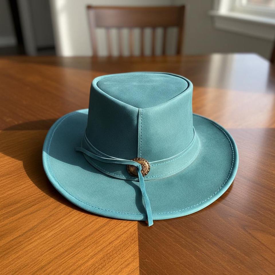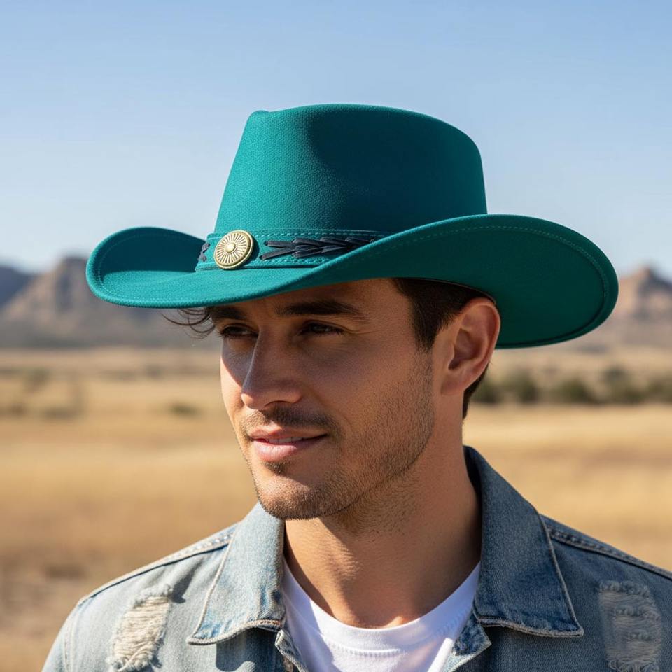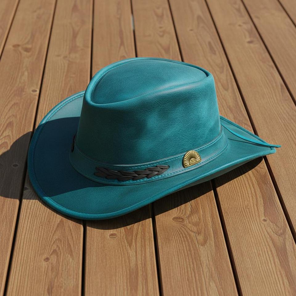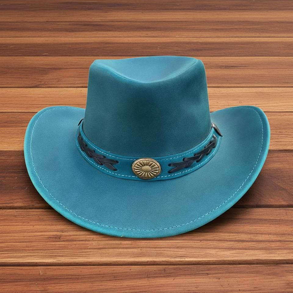 หมวกคาวบอยหนังแท้สีเขียวอมฟ้า ทำมือ สไตล์เวสเทิร์น สตีมพังก์ สำหรับงานเทศกาล ขายส่ง ราคาไม่แพง
