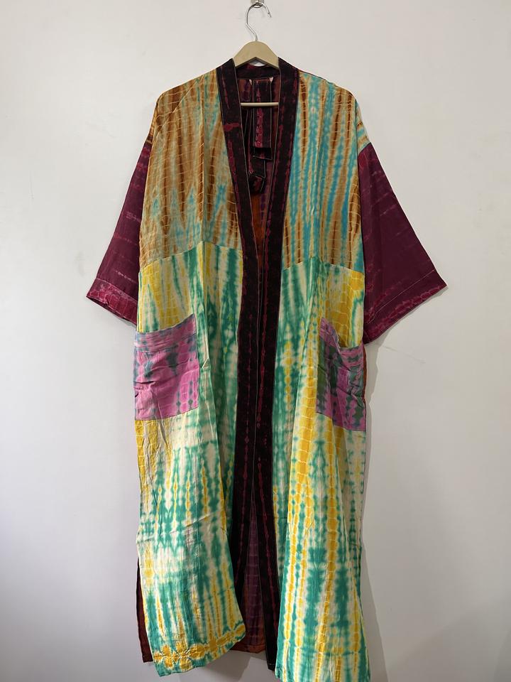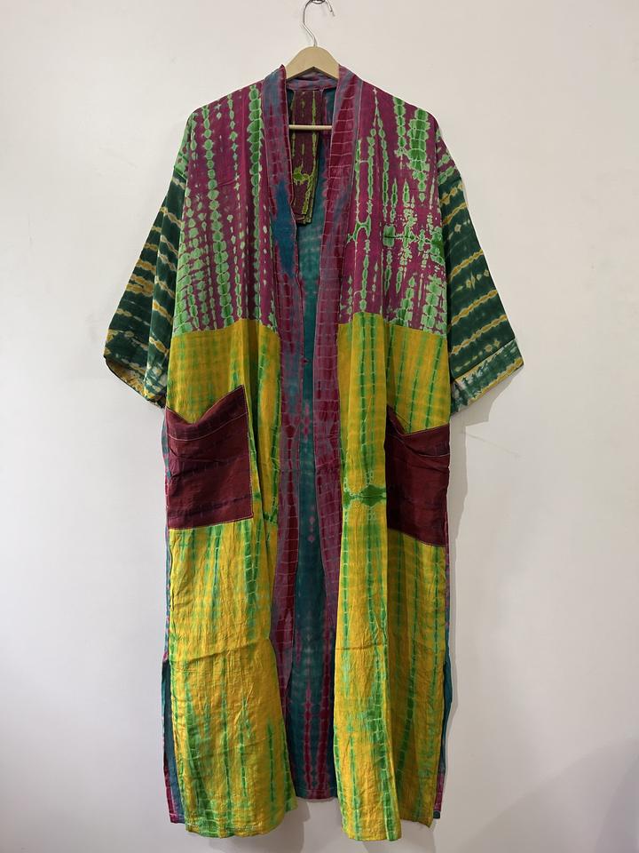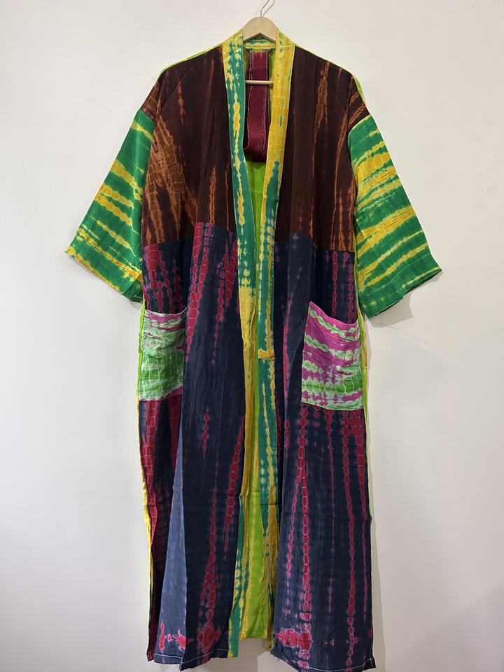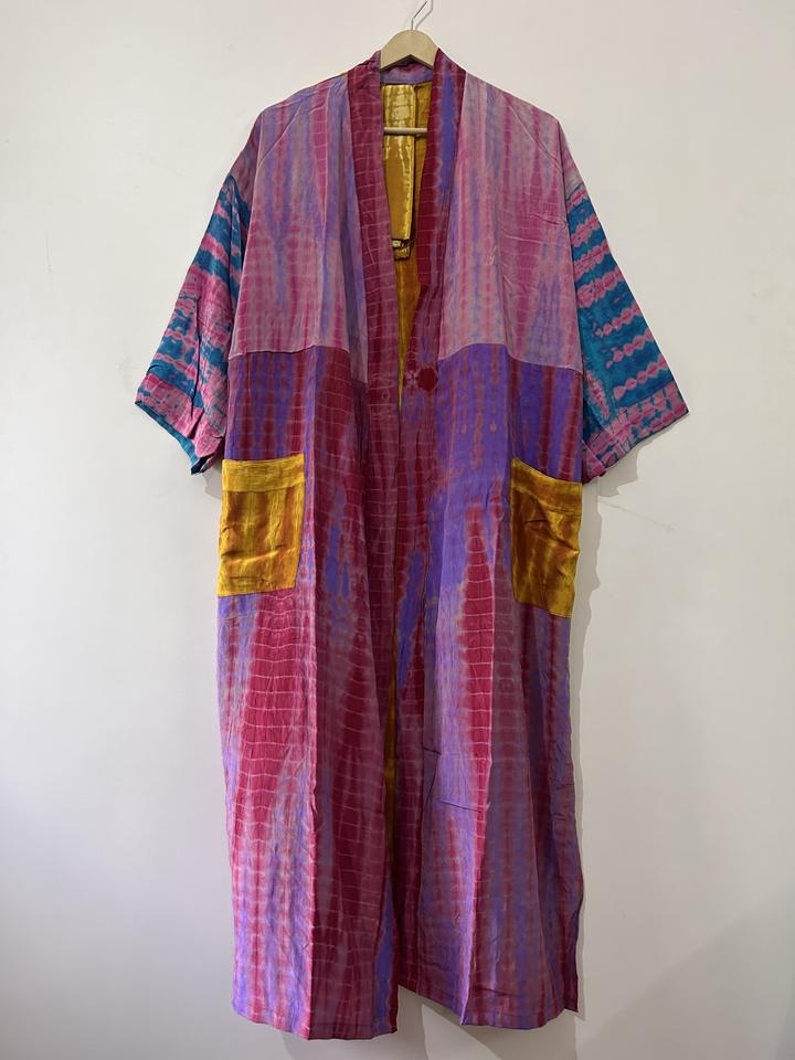 ชุดกิโมโนผ้าไหมย้อมสีแบบทำมือ แต่งผ้าแบบแพทช์เวิร์ค สไตล์วินเทจ ชุดคลุมยาว
