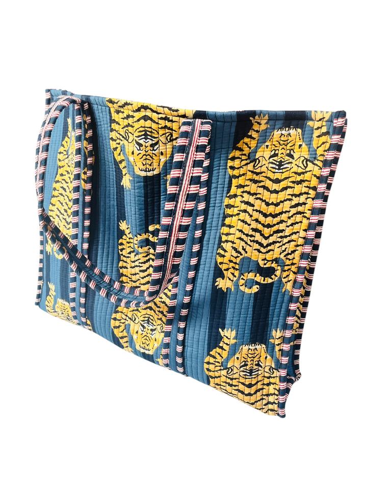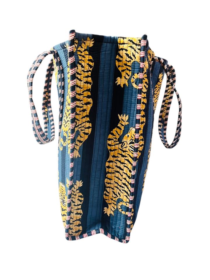 กระเป๋าโท้ทผ้าฝ้ายลายเสือทำมือ กระเป๋าสะพายไหล่ลายพิมพ์บล็อกด้วยมือ กระเป๋าเดินทางและช้อปปิ้ง แฟชั่นอุปกรณ์เสริม
