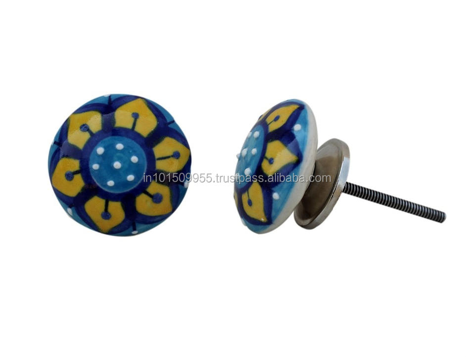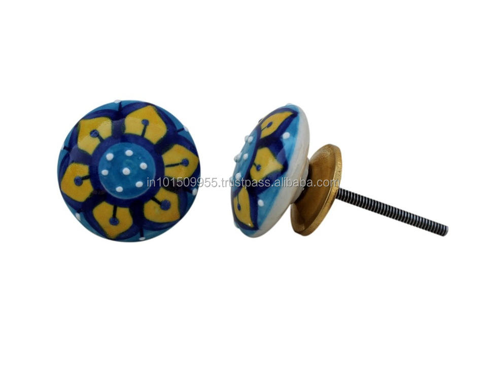 แฮนด์เมดเซรามิกสีฟ้าคุณภาพสูงดวงอาทิตย์ดอกไม้ลิ้นชักลูกบิดตู้แต่งตัวดึงตู้ครัวมือจับประตูขายส่ง CK-961
