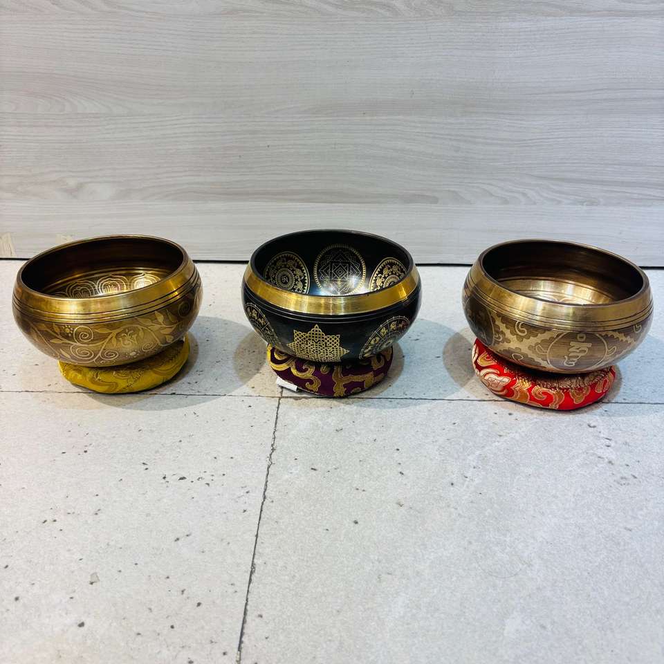 ชามร้องเพลงหิมาลัยทำด้วยมืองานฝีมือโลหะที่ได้แรงบันดาลใจจากศาสนาพุทธสำหรับการบำบัดด้วยเสียงจักระ