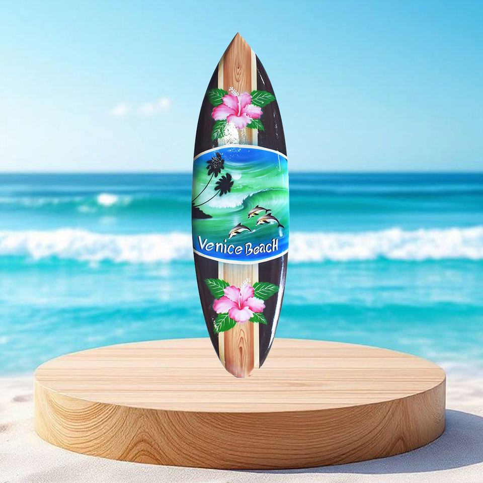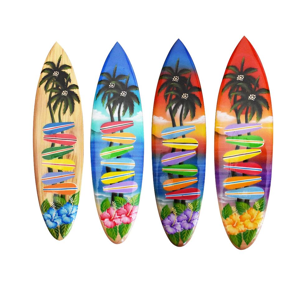 กระดานโต้คลื่นฮาวายชายหาดเขตร้อนงานแฮนด์เมดศิลปะแขวนผนัง50ซม. ต้นปาล์มและดอกชบา