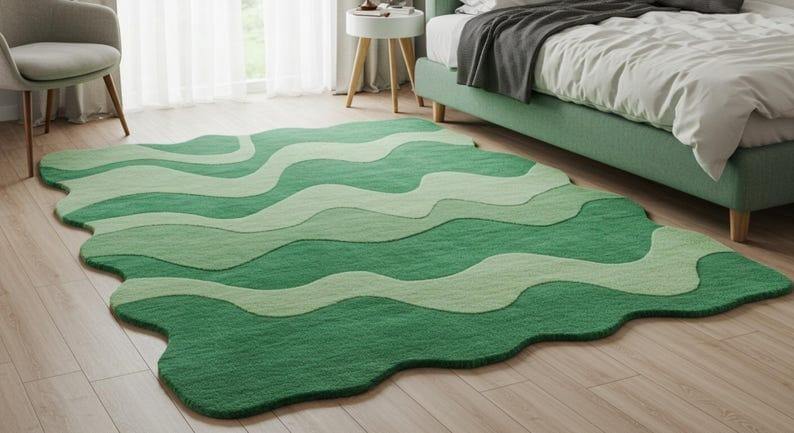 พรมขนแกะทำด้วยมือคุณภาพสูงพรมปูพื้นสไตล์โมเดิร์นลายคลื่นสีเขียวแบบร่วมสมัยสำหรับห้องนั่งเล่นและห้องนอน