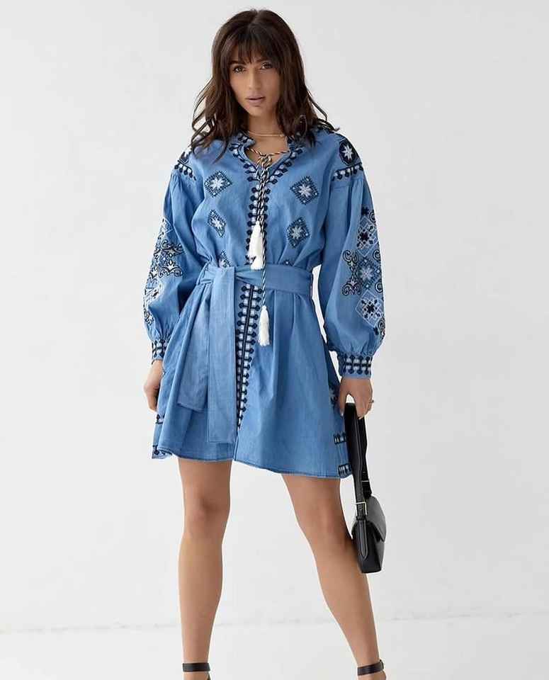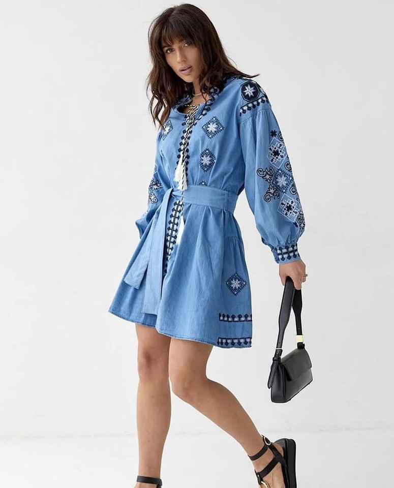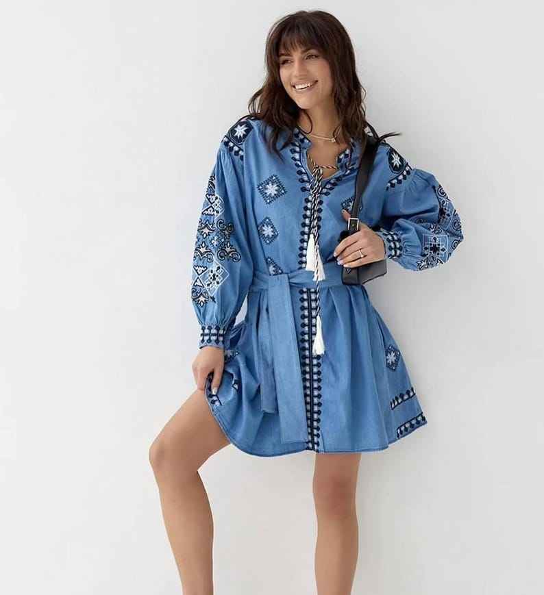 ชุดยูเครนทำด้วยมือ vyshyvanka ชุดเดรสปักลายสำหรับผู้หญิงชุดเดรสปักลายสีฟ้าสไตล์ยีนส์