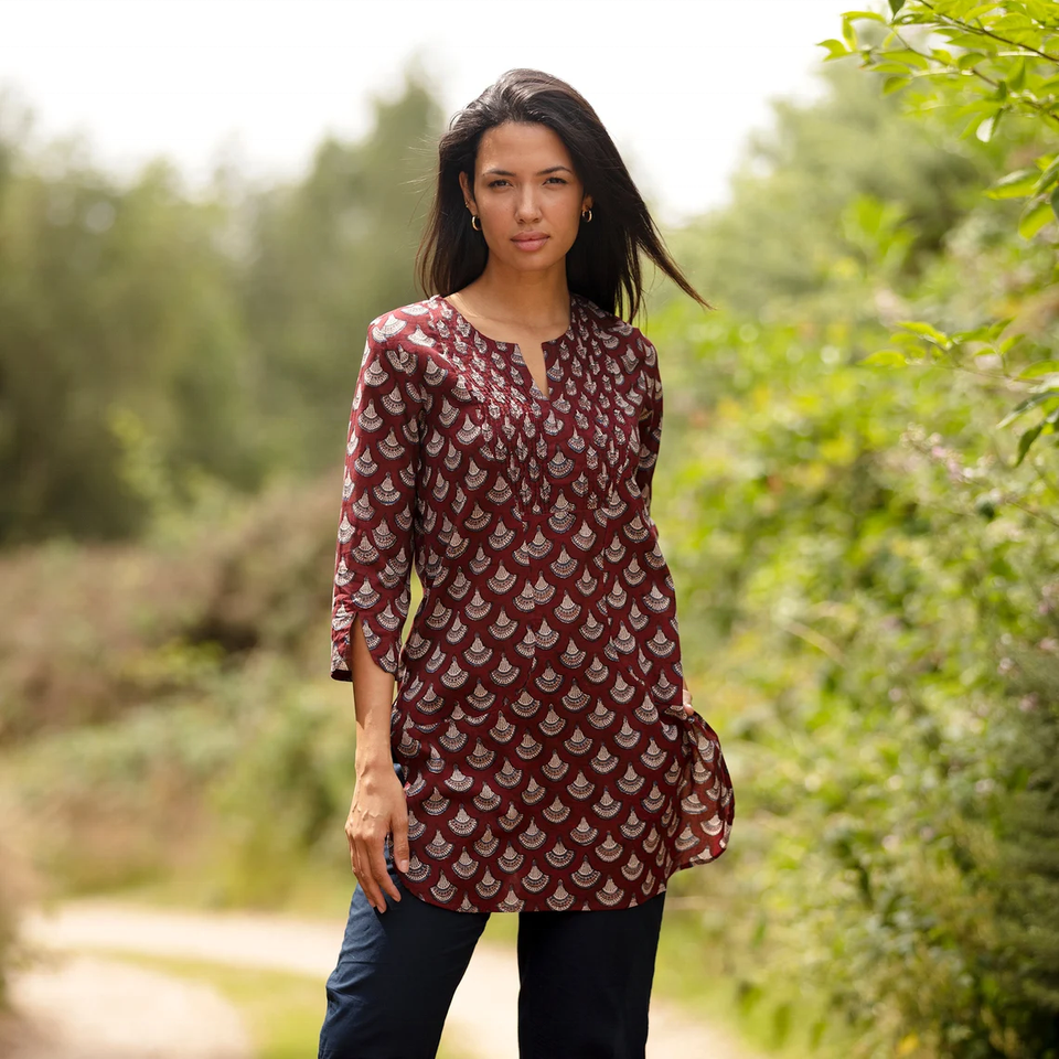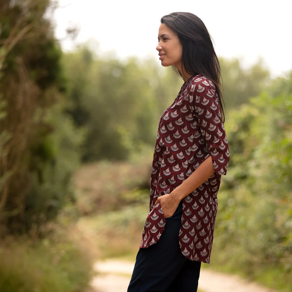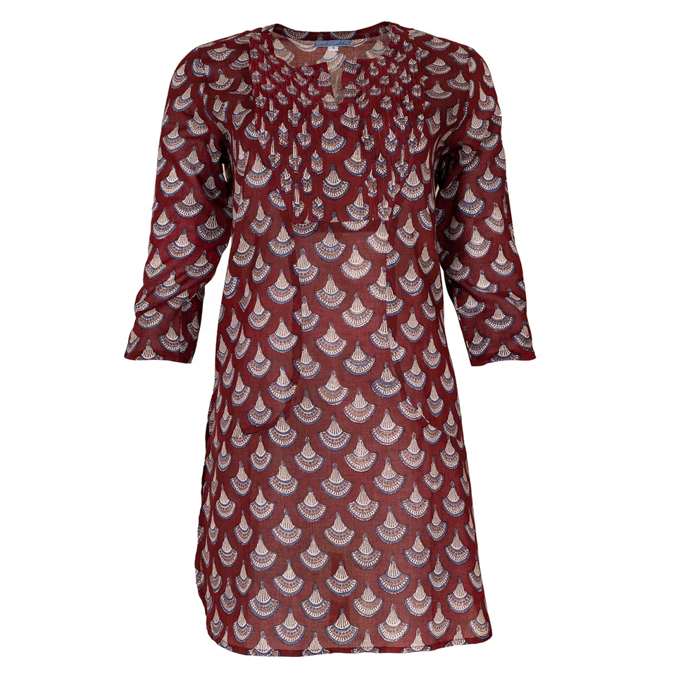 เสื้อคุर्ตาขายดี รุ่นที่ 3 สีเบอร์กันดี ลายเปลือกหอย ผ้าฝ้าย 100% พิมพ์ลายบล็อก จีบพินทัค