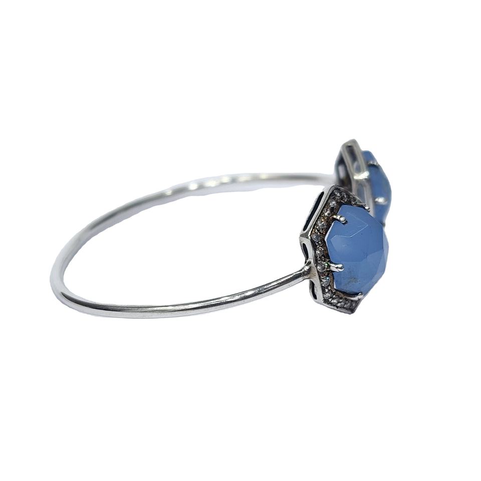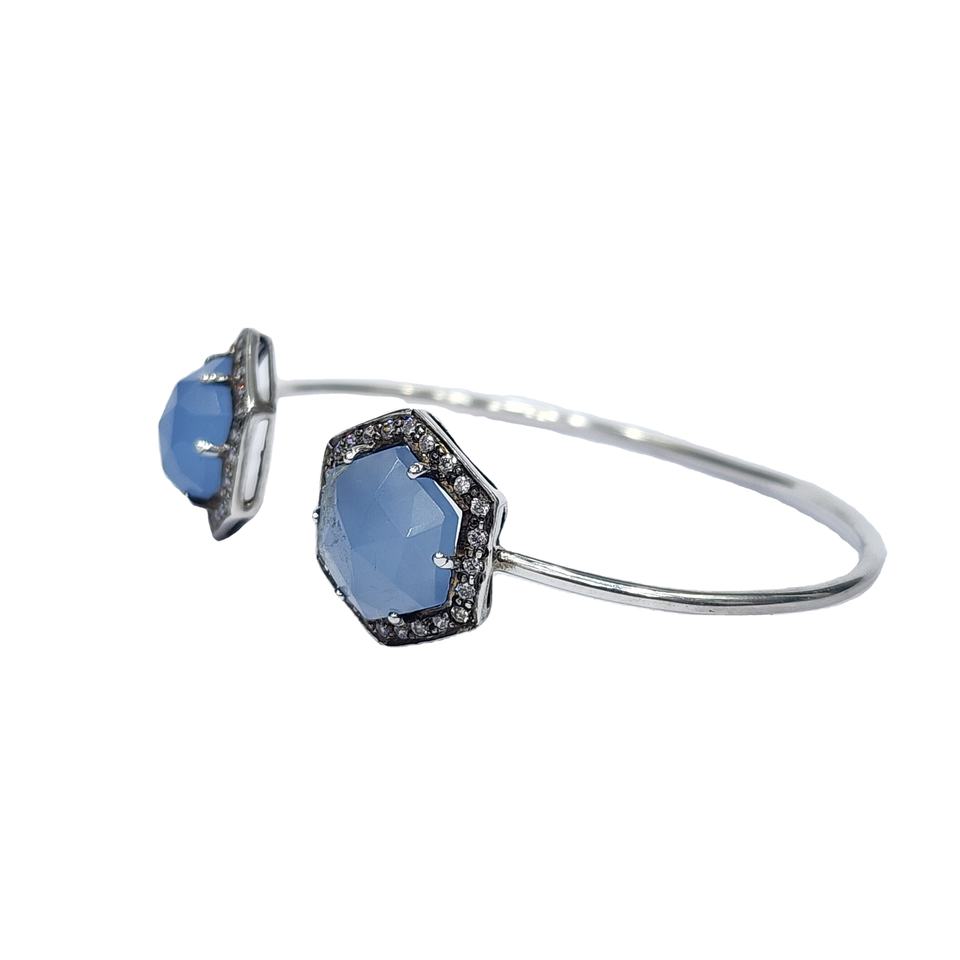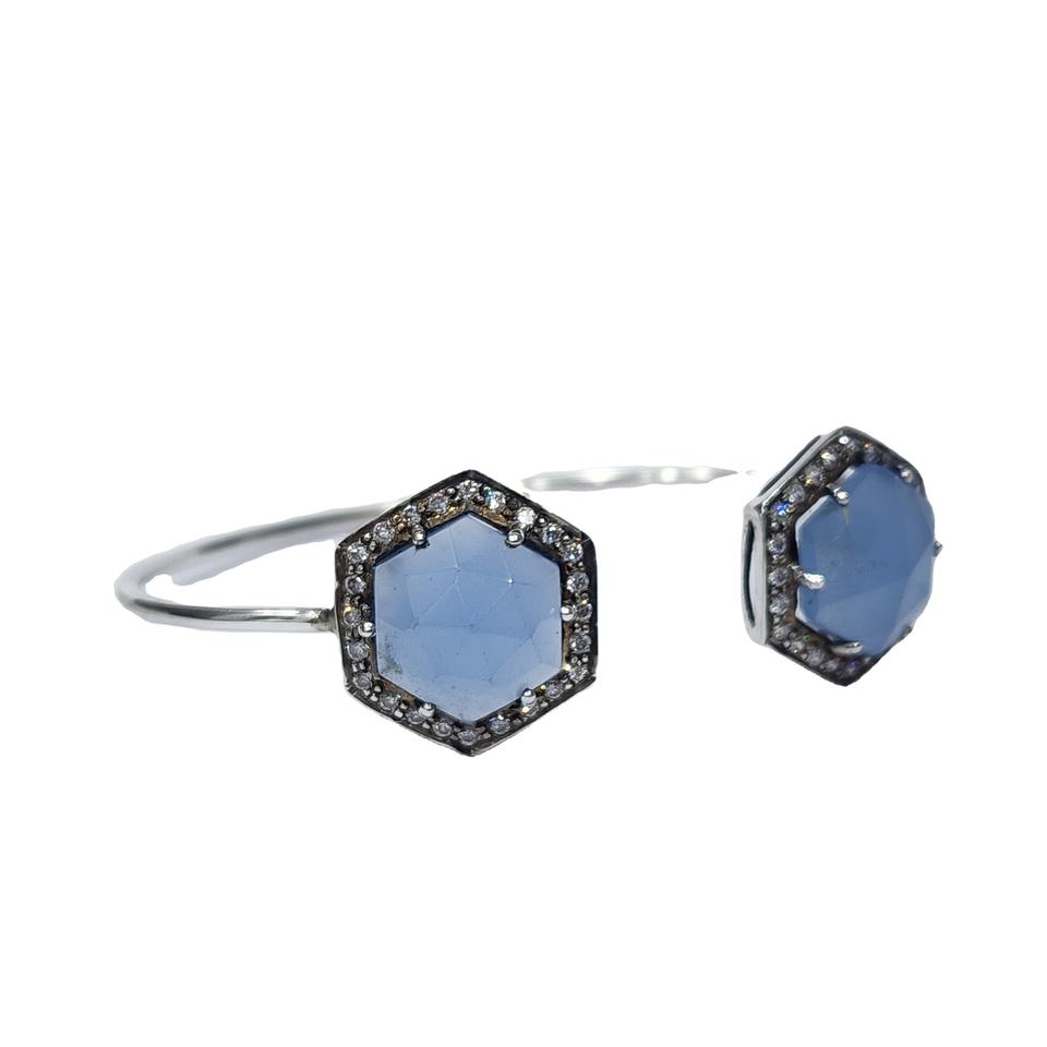 กําไลข้อมือปรับได้ไม่ซ้ําใครที่ทําด้วยมือ 925 รูปทรงหกเหลี่ยมธรรมชาติเงินสเตอร์ลิงพร้อมชุบเพชรสีน้ําเงินและพลอยเซอร์โคเนียทรงกลม