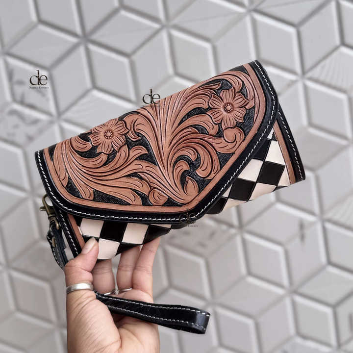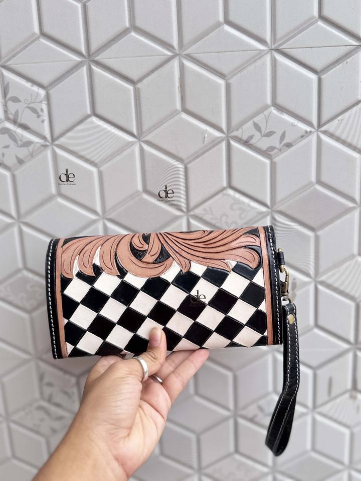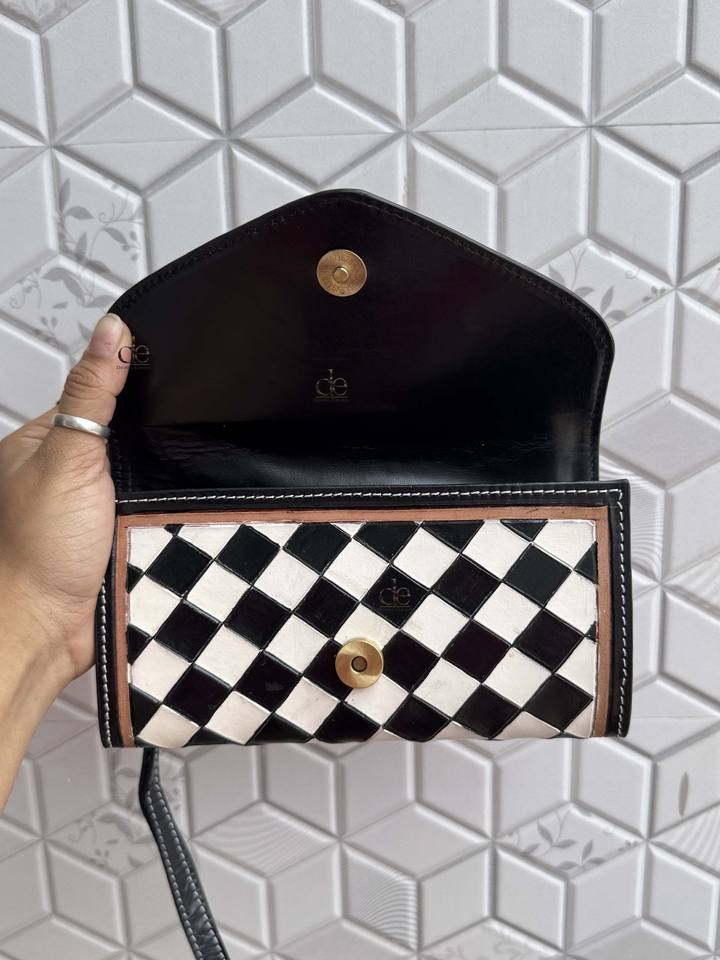 กระเป๋าคลัทช์หนังแท้สำหรับผู้หญิงทำมือดีไซน์เนอร์ไม่เหมือนใครทำด้วยมือเคสโทรศัพท์ลายหมากรุกที่ทันสมัย