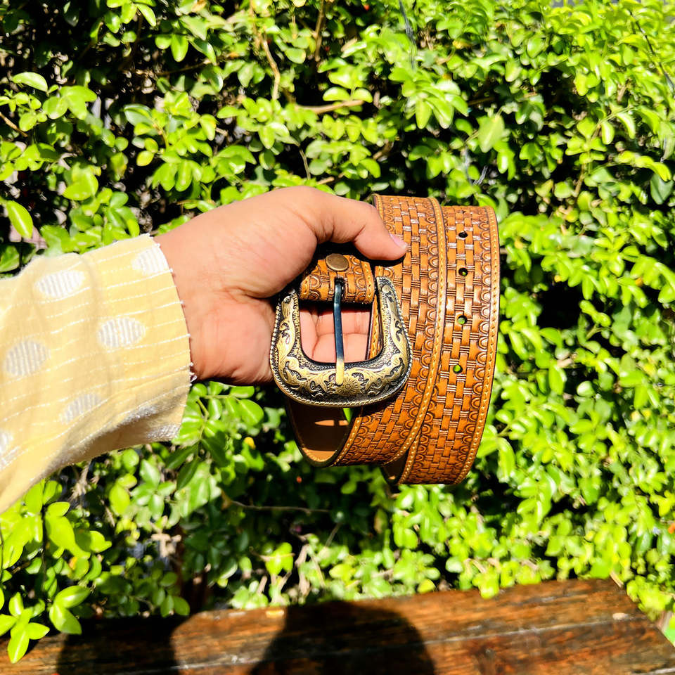 เข็มขัดหนังวัวแท้ทำมือสำหรับทุกเพศ สไตล์คลาสสิกหรูหราสำหรับการแข่งขัน แบบตะวันตกสไตล์รันชิ่ง หัวเข็มขัดโลหะผสมสังกะสีรูปมงกุฎแบบถอดได้