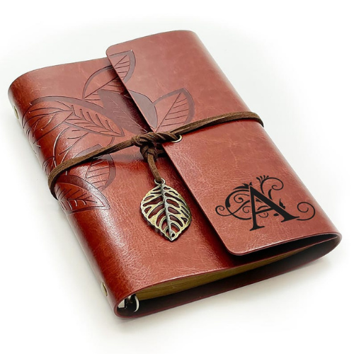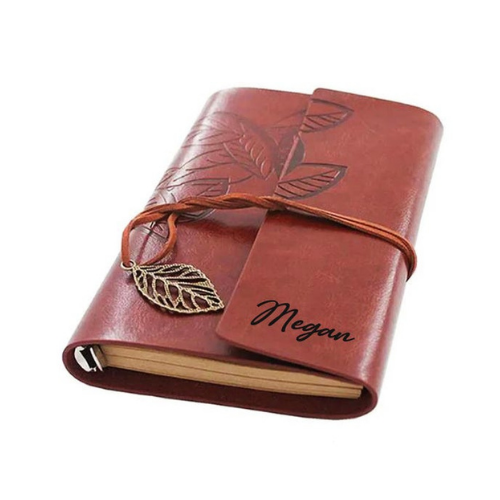 ชื่อผลิตภัณฑ์:สมุดบันทึกหนังวีแกนสีน้ำตาลสลักลายใบไม้ทองเหลือง