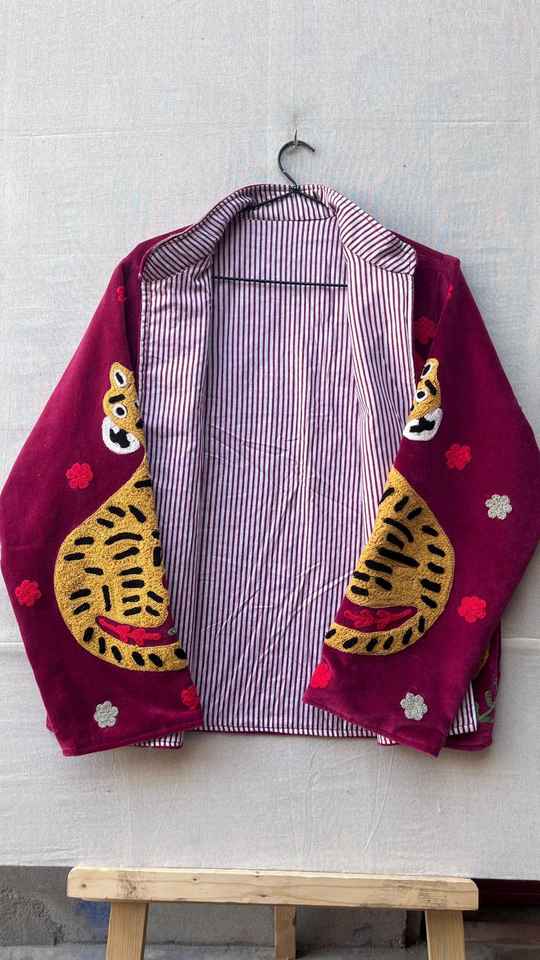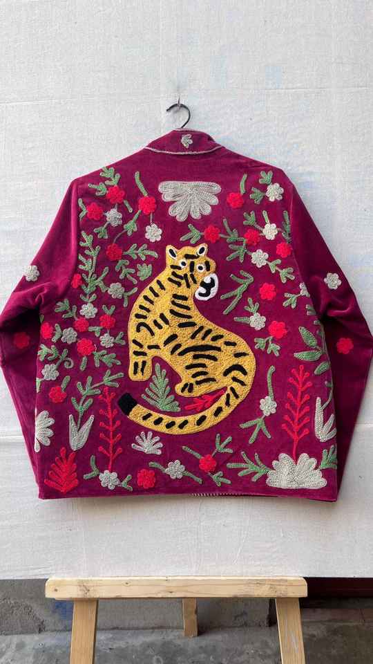 Handmade Velvet Suzani Jacket Red Tiger Floral Embroidery Boho Coat Floral Duster Coat