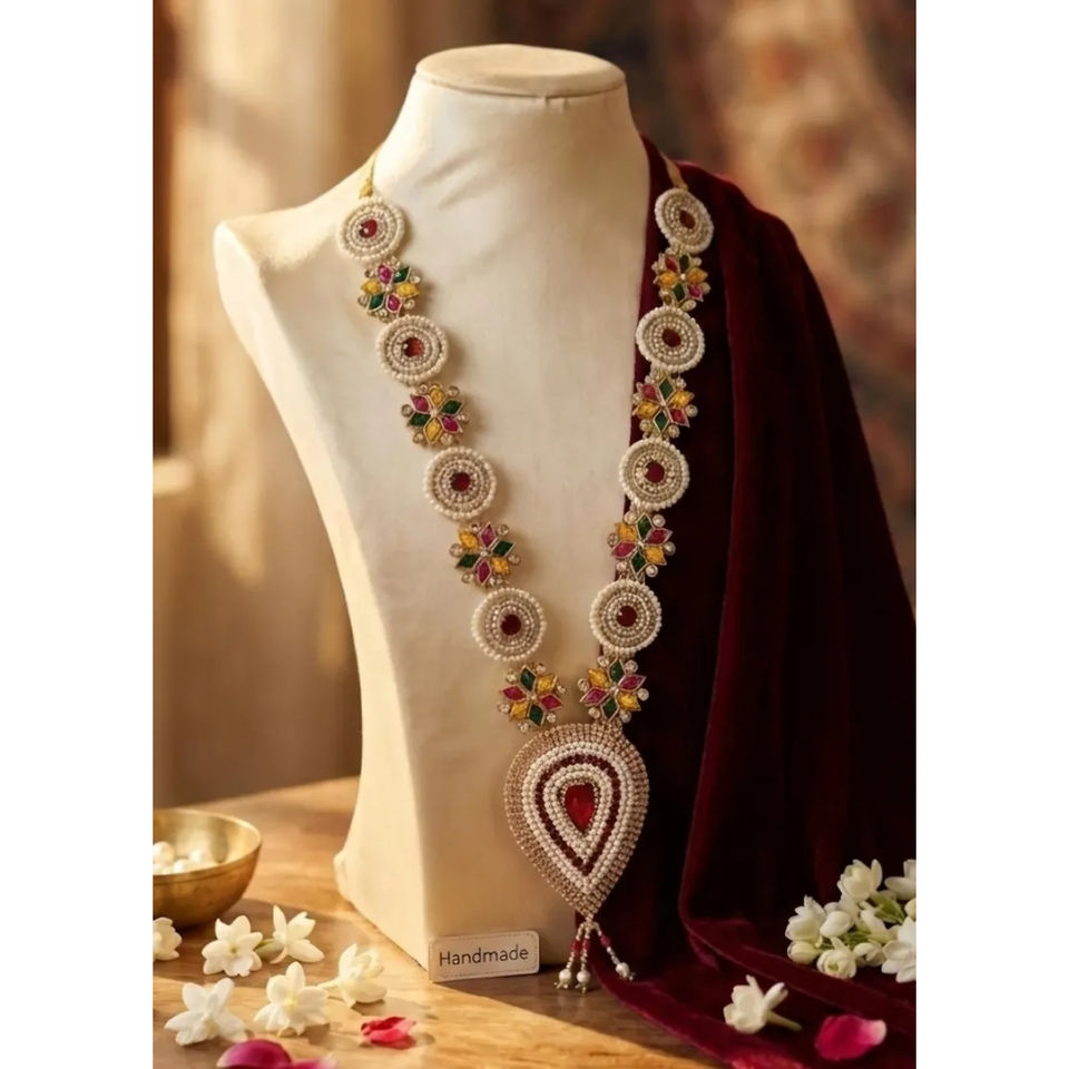 Handmade Vibrant Floral Pearl Mala with Ruby-Red Pendant for Pooja Weddings and god idol