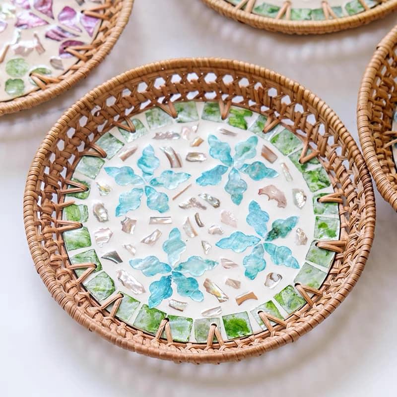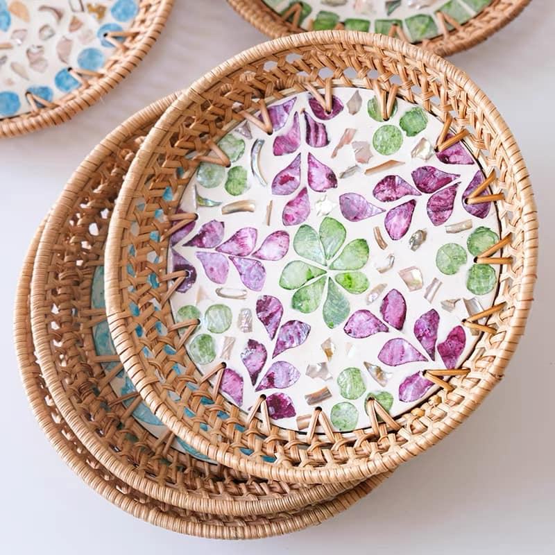 ตะกร้าหวายทำด้วยมือสไตล์เวียดนามขนาดใหญ่ถาดเสิร์ฟทำจากไม้ถาดรองแก้วกาแฟขนมขบเคี้ยวของหวานผลไม้ชา