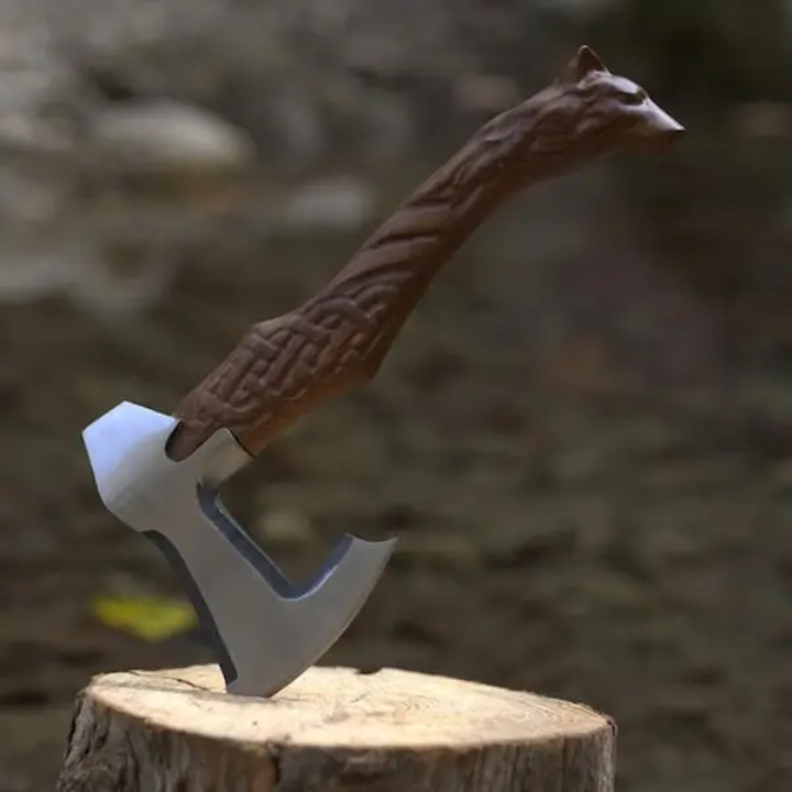 ขวานไวกิ้งทำมือพร้อมด้ามไม้แอชสลักลายและปลอกหนังพร้อมลายสลักบนใบมีด