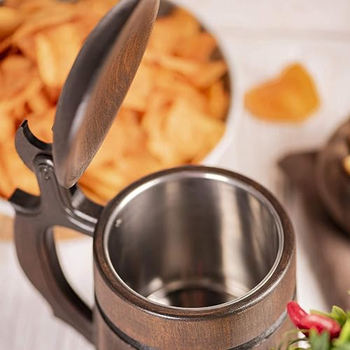 แก้วมักใส่เบียร์และถ้วยสำหรับดื่มไวน์สีน้ำตาลเปลือกไม้ทรงกลมทำด้วยมือ