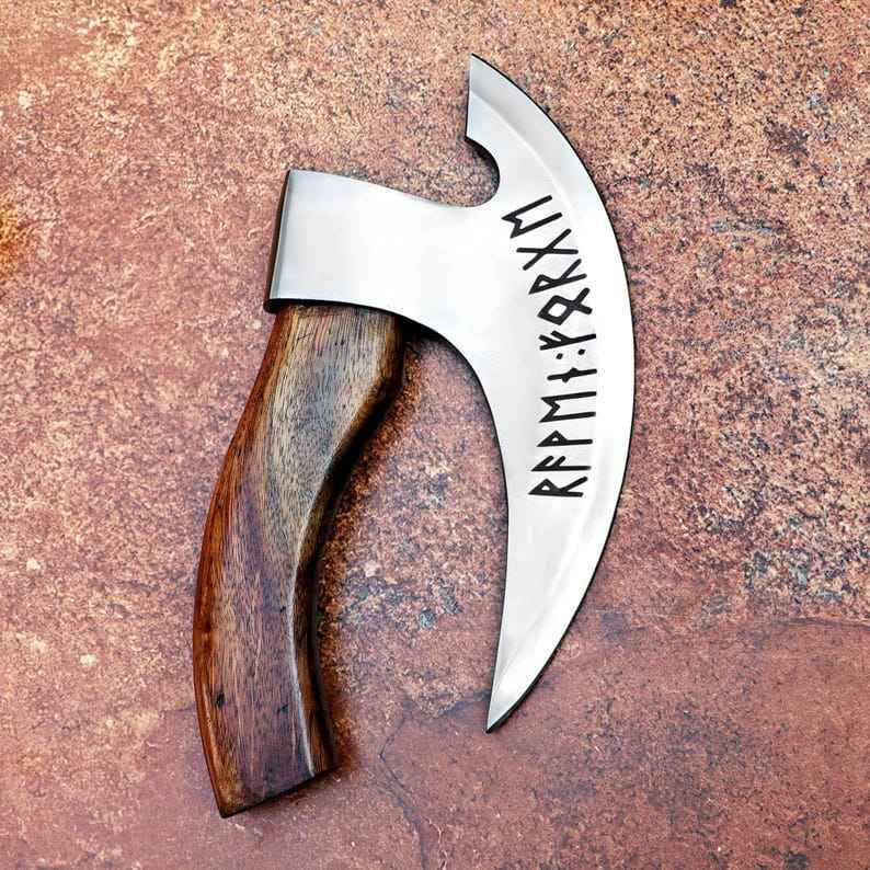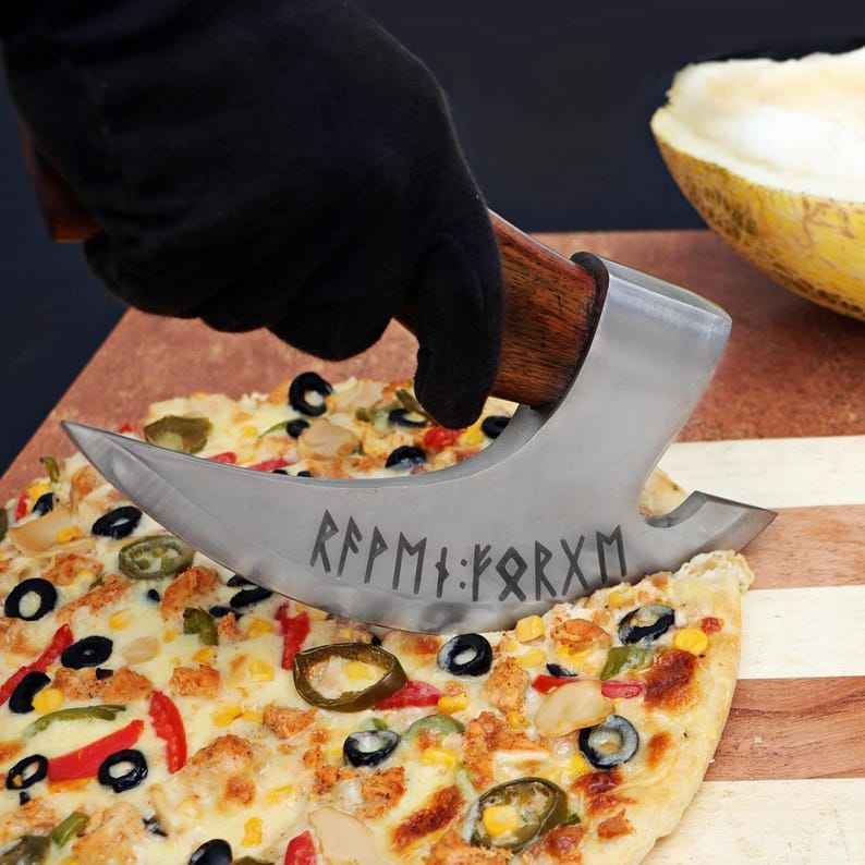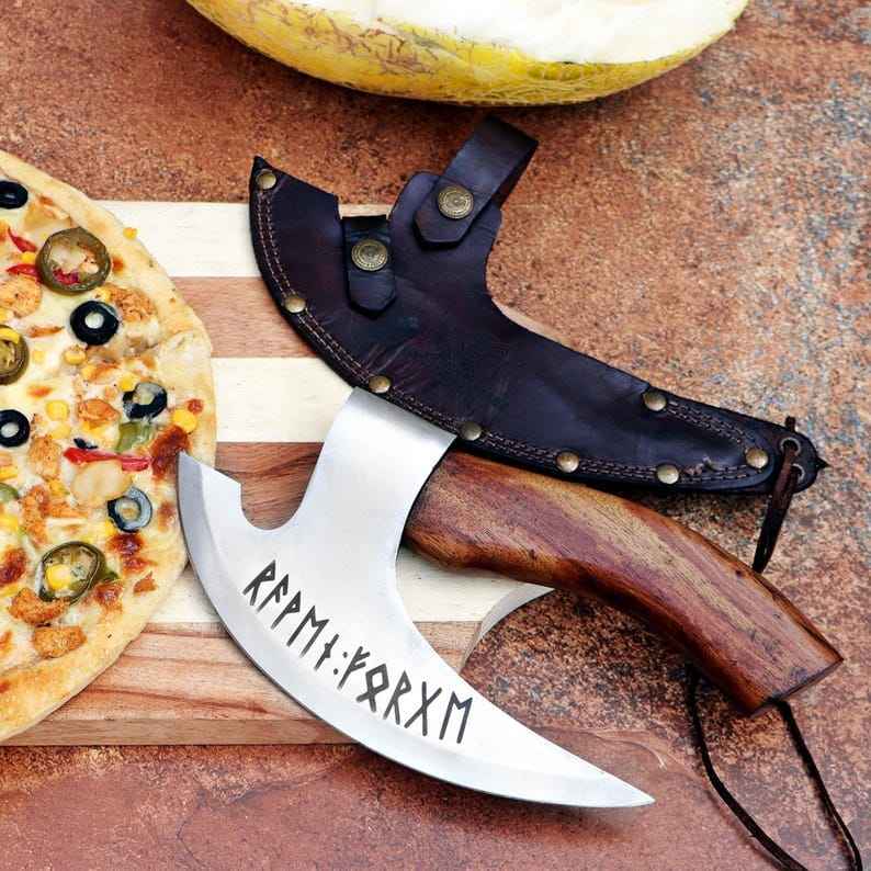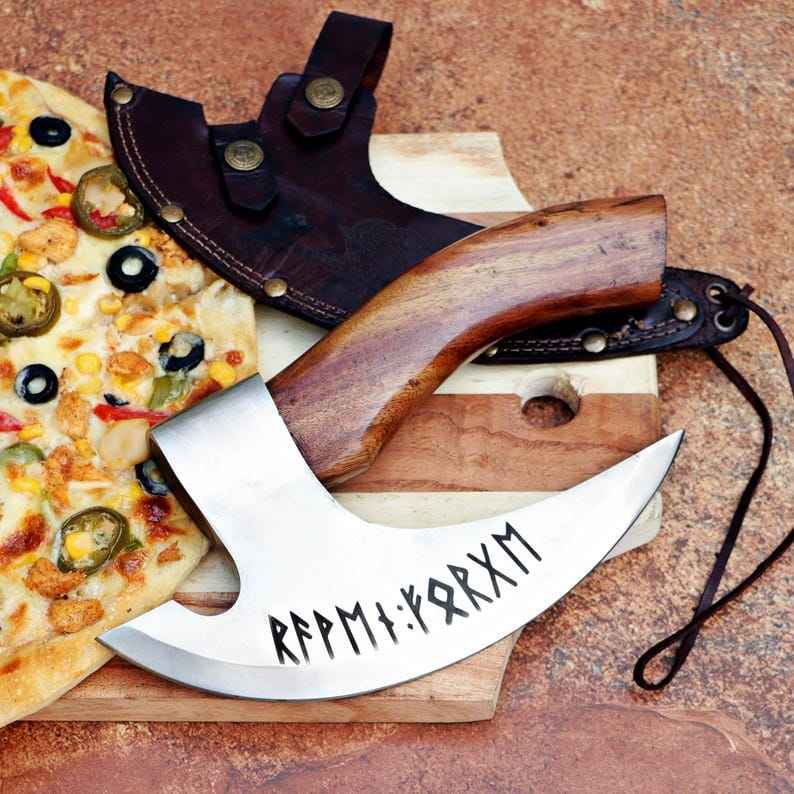 ที่ตัดพิซซ่ารูปขวานสไตล์ไวกิ้ง ทำมือ ตีขึ้นรูปด้วยมือ คุณภาพระดับอุตสาหกรรม ด้ามไม้ ที่ตัดพิซซ่าแบบขวาน ของขวัญและอุปกรณ์สำหรับกิจกรรมกลางแจ้ง