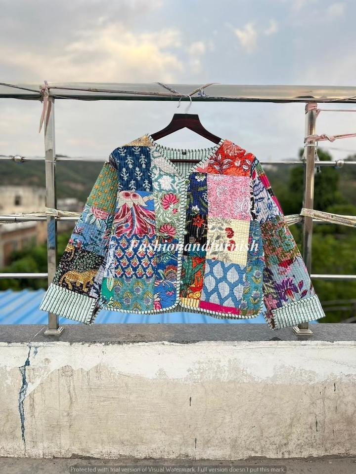 แจ็กเก็ตโบโฮวินเทจทำด้วยมือสำหรับผู้หญิงแจ็กเก็ตผ้าฝ้ายส่าหรีลายตัวอักษร
