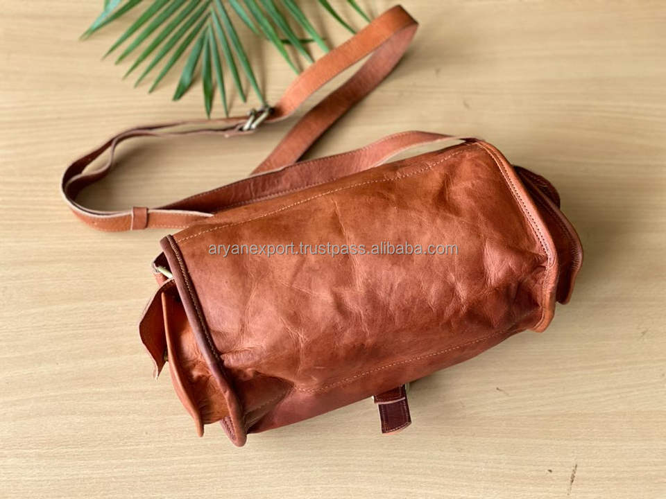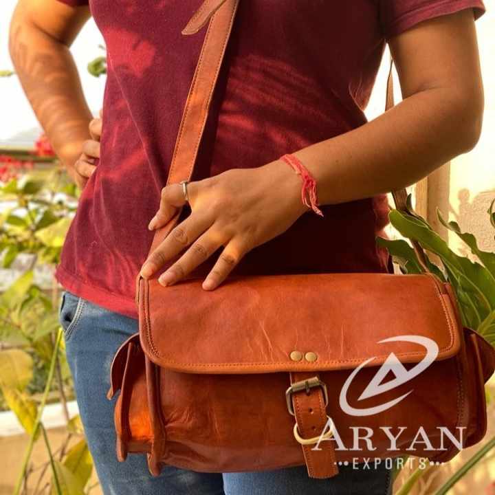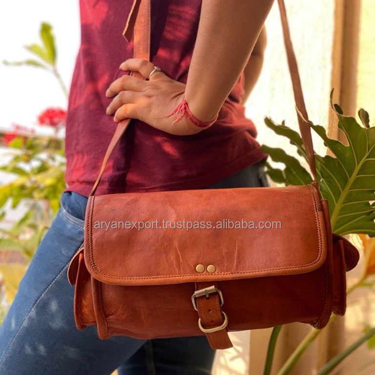 กระเป๋าสะพายสีน้ำตาลวินเทจทำด้วยมือกระเป๋าสะพายไหล่หนังแพะแท้สายเดี่ยวหนังแท้บุหนังแท้กระดุมปิดอาน