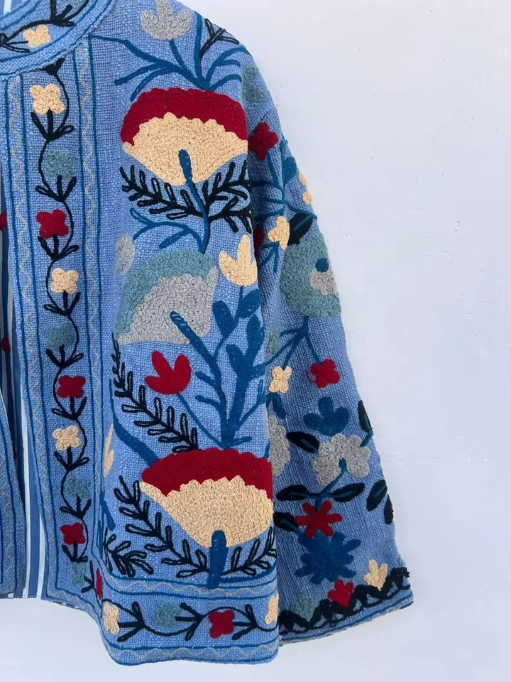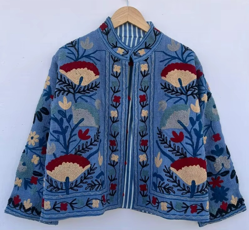 เสื้อแจ็คเก็ตปักลายดอกไม้สไตล์วินเทจทำมือ ระบายอากาศได้ดี กันลม | เสื้อโค้ทแบบกลับด้านได้สำหรับฤดูใบไม้ร่วง/ฤดูหนาว | ผ้าฝ้ายที่เป็นมิตรต่อสิ่งแวดล้อม