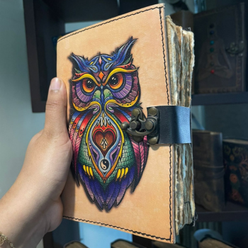 สมุดบันทึกหนังวินเทจทำมือ - สมุดบันทึกลายแมนดาลาพิมพ์ UV รูปนกฮูก พร้อมกระดาษขอบฉีกและเย็บเข้าเล่ม เหมาะสำหรับเป็นของขวัญ