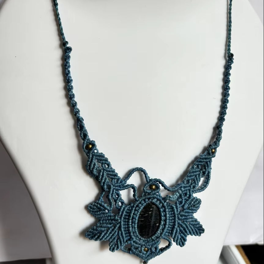 สร้อยคอโซ่ถักมือสไตล์วินเทจทำด้วยมือหินเทอร์ควอยซ์ขนาด25-30มม. ชุดฝาเส้นด้ายสีเทาของขวัญสุขสันต์วันเกิดสำหรับผู้หญิง