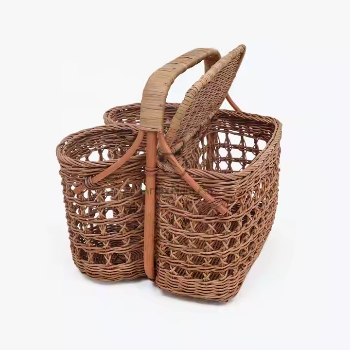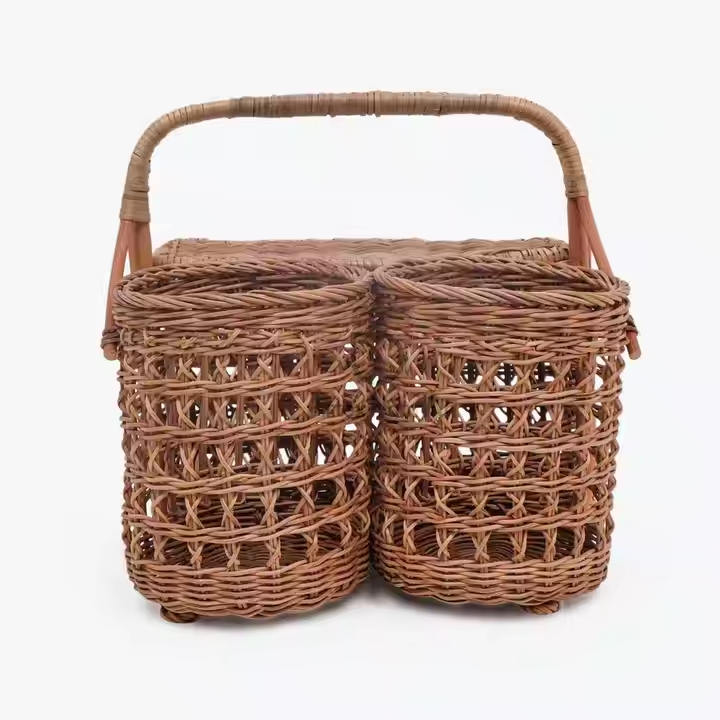 ตะกร้าปิกนิกหวายแบบแฮนด์เมดสไตล์วินเทจพร้อมที่วางไวน์สองชั้นสำหรับใช้งานกลางแจ้ง