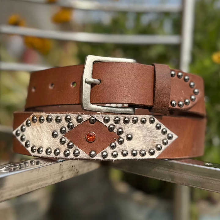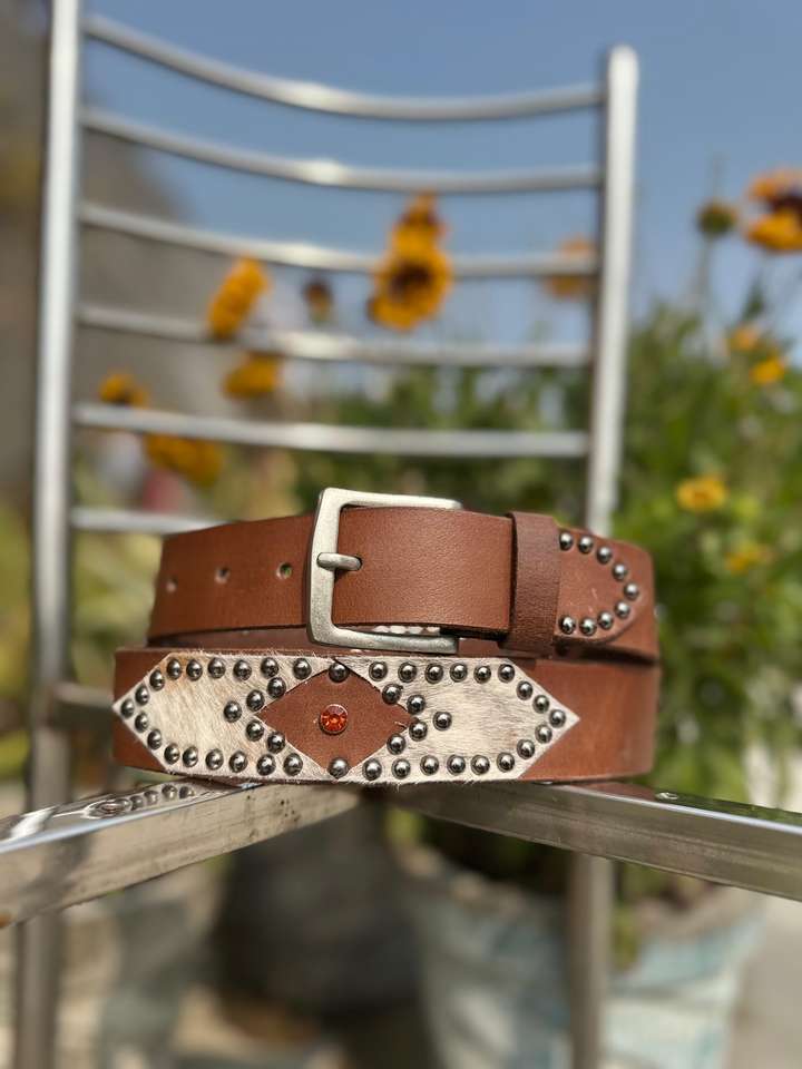 เข็มขัดหนังทำมือสไตล์วินเทจประดับหมุด พร้อมลายดอกไม้พิมพ์ด้วยความร้อน หัวเข็มขัดเหล็กแข็งแรงทนทาน ความกว้าง 1-1.5 นิ้ว