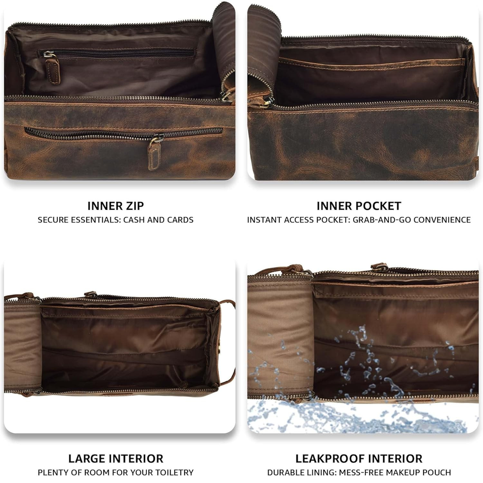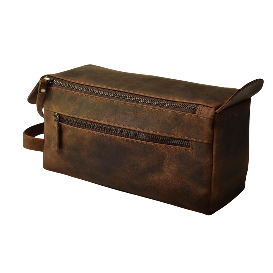 กระเป๋าหนังแท้สไตล์วินเทจทำด้วยมือชุดเครื่องแป้งแบบมีซิปคู่พร้อมที่จับด้านข้าง